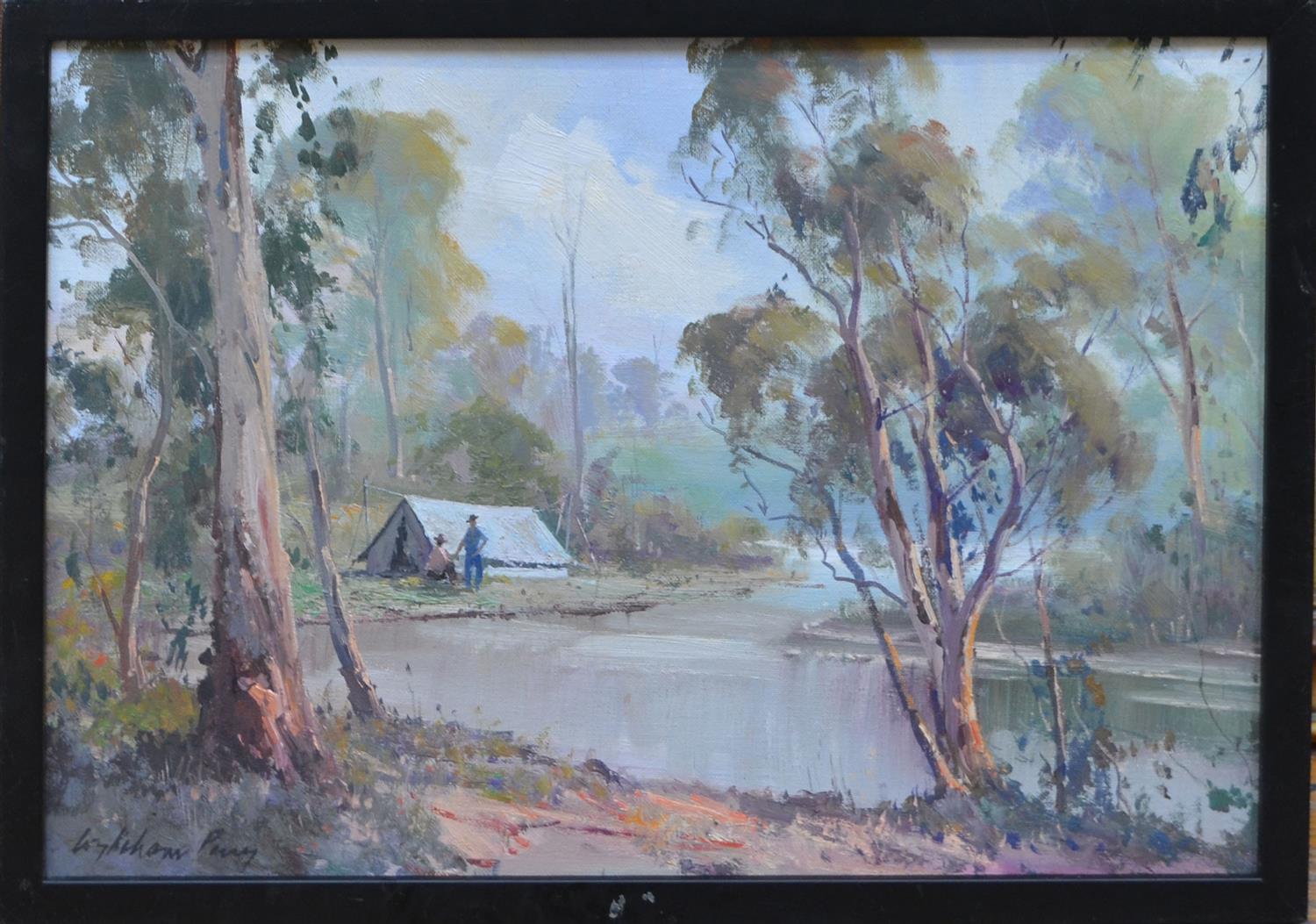 WYKEHAM PERRY, LANDSCAPE CAMPERS, OIL ON BOARD, 36 X 48CM, FRAME SIZE: 39 X 52CM, CONDITION: VERY GOOD