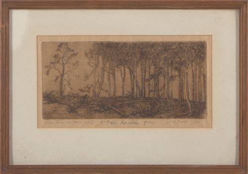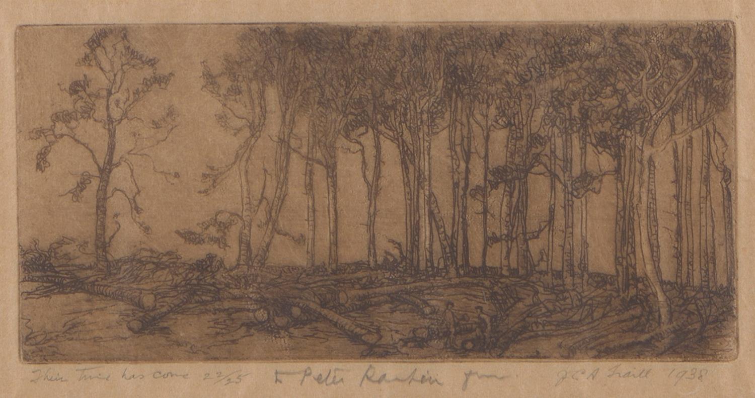 This work depicts Landscape of felled and still-standing trees, Northumberland, England. A lone tree stands on the left with the remains of fallen trees surrounding it.