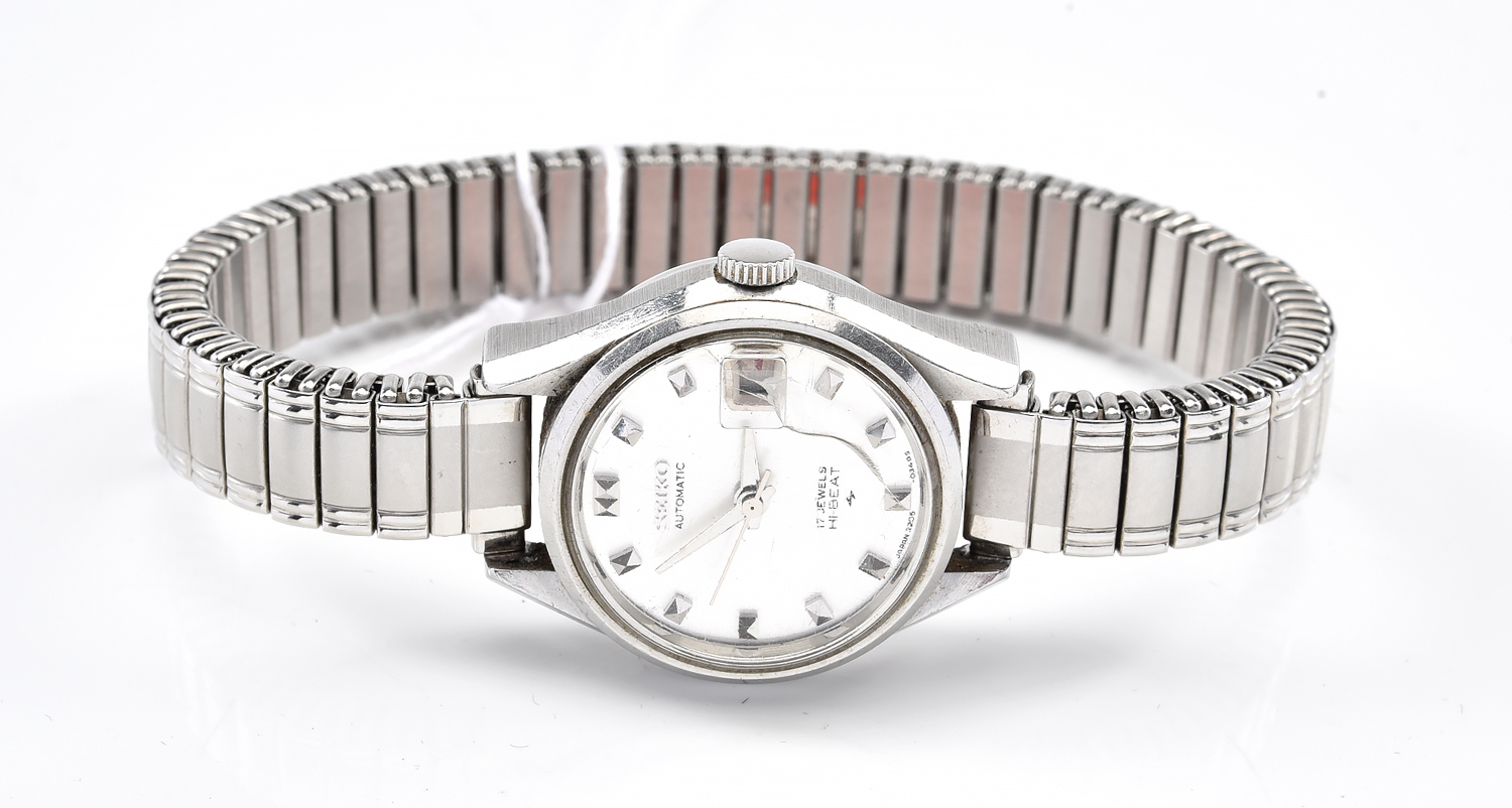 A VINTAGE LADIES SEIKO AUTOMATIC WRISTWATCH TO STAINLESS STEEL CASE AND BANDS, A/F.