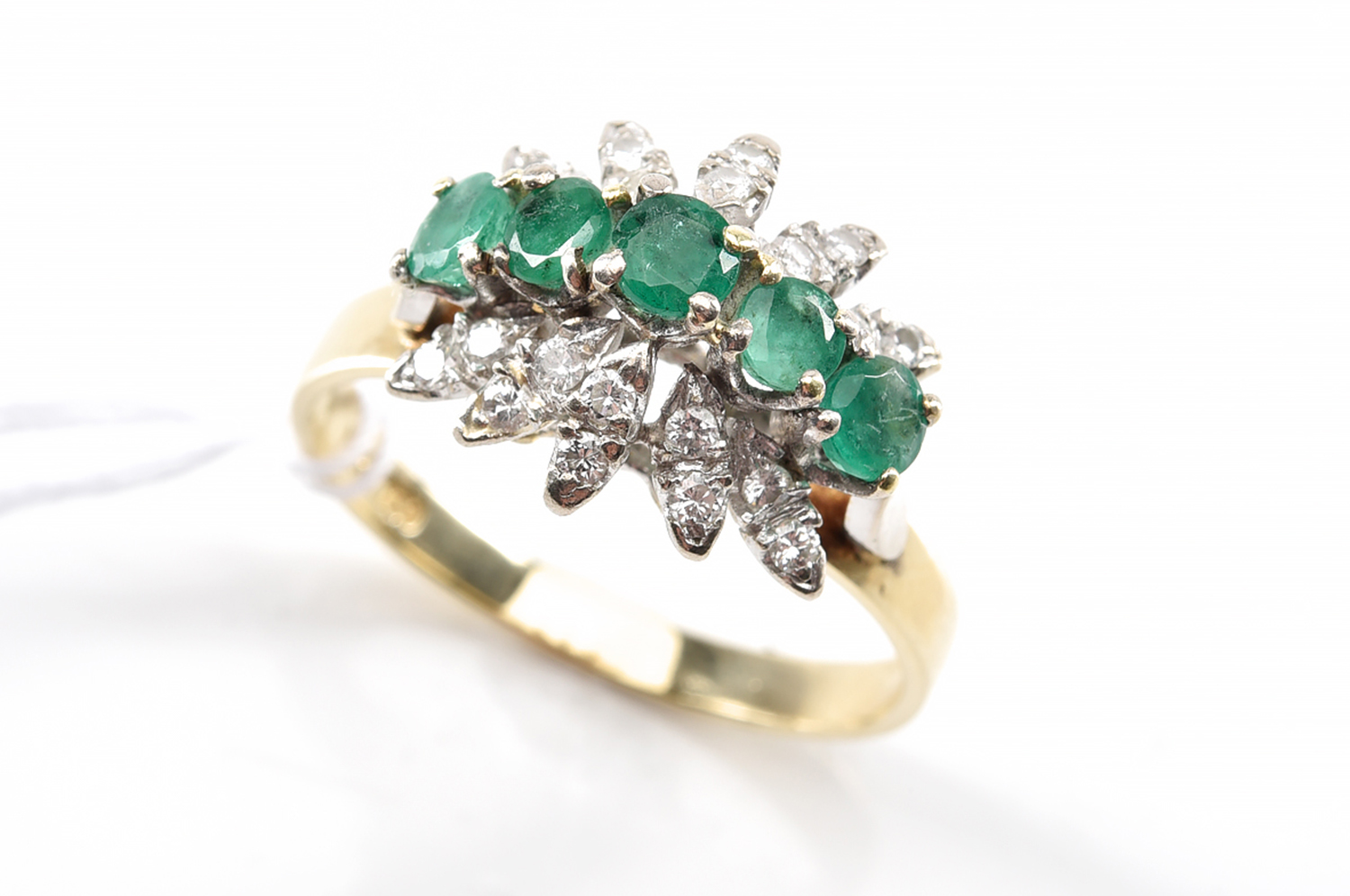 A 1950s EMERALD AND DIAMOND DRESS RING IN 18CT GOLD, RING SIZE V-W, 5.9 GRAMS