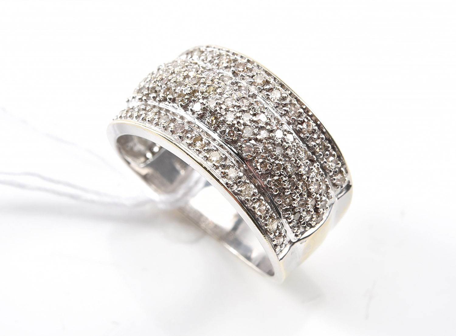 A WIDE DIAMOND SET BAND IN 18CT WHITE GOLD, RING SIZE N, 5.5 GRAMS