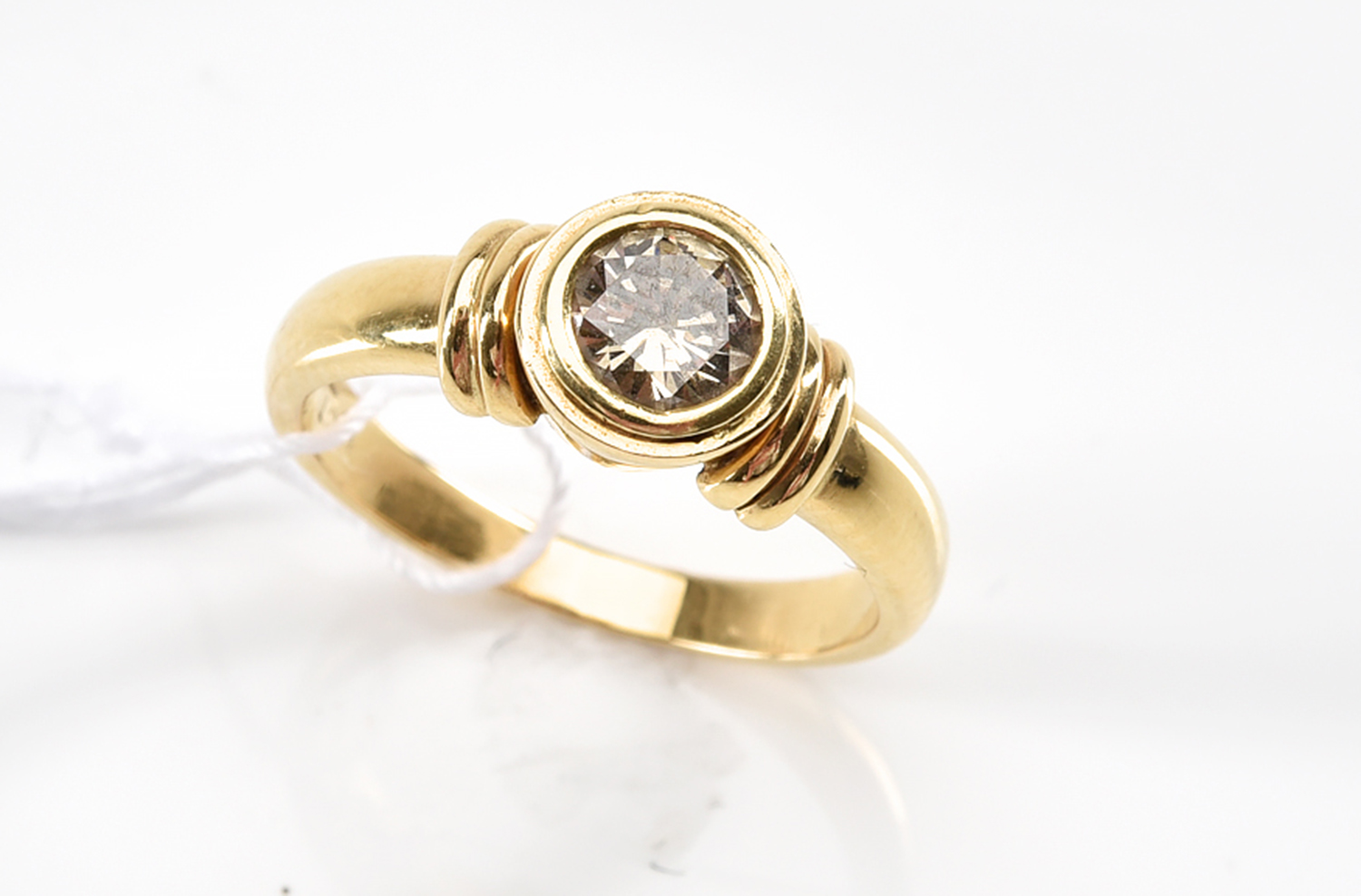 The champagne diamond measure approximately 4.36x4.32x2.50mm in its bezel setting. Estimated clarity VS.