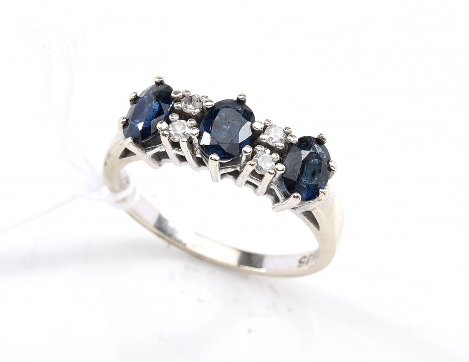 A SAPPHIRE AND DIAMOND RING IN 14CT WHITE GOLD, RING SIZE N, 3.5 GRAMS