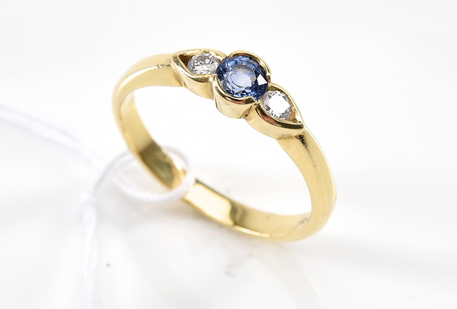 A SAPPHIRE AND DIAMOND DRESS RING IN 18CT GOLD, RING SIZE O, 3.5GMS