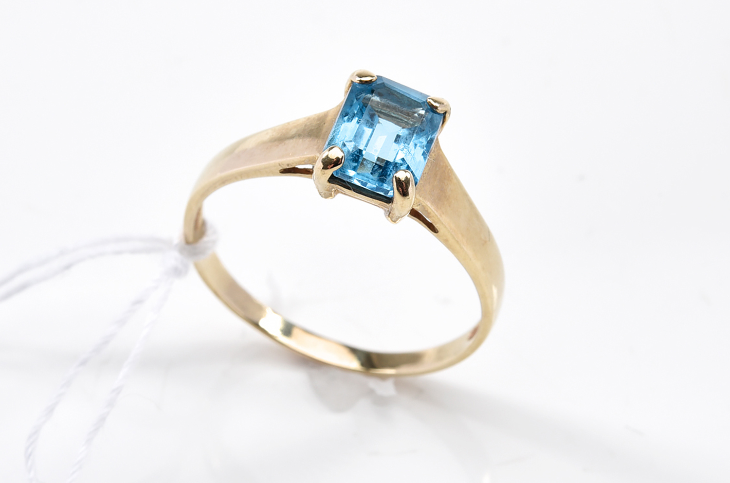 A BLUE STONE RING IN 9CT GOLD, RING SIZE T, 2.2GMS