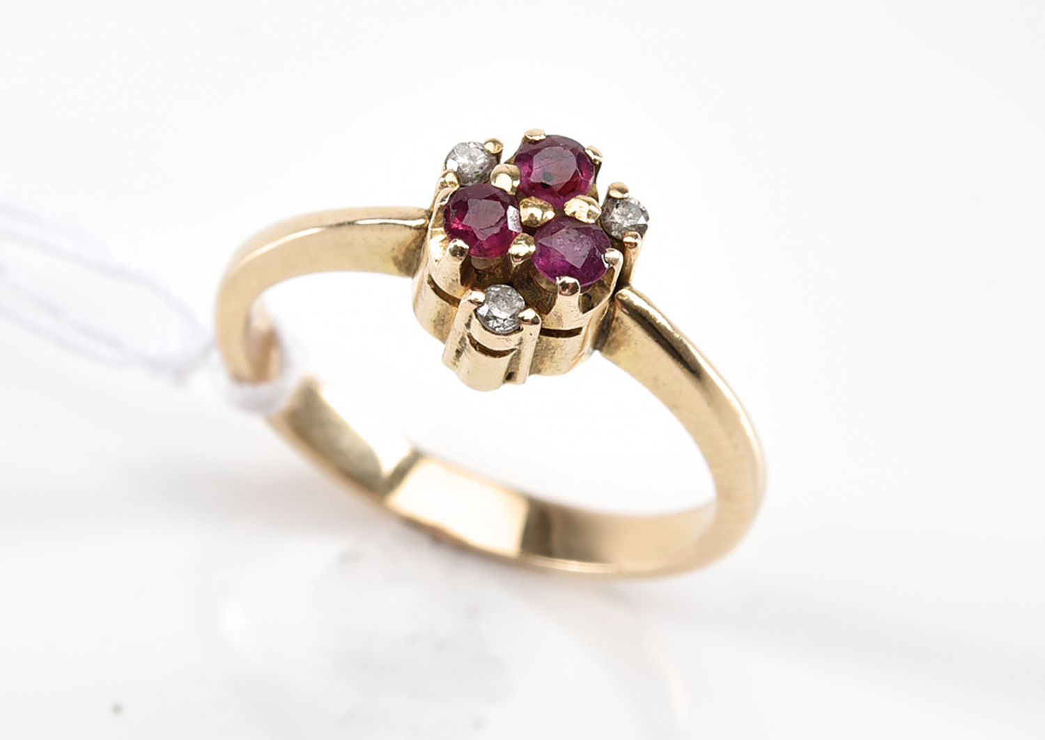 A RUBY AND DIAMOND CLUSTER RING IN 14CT GOLD, SIZE L, 3GMS