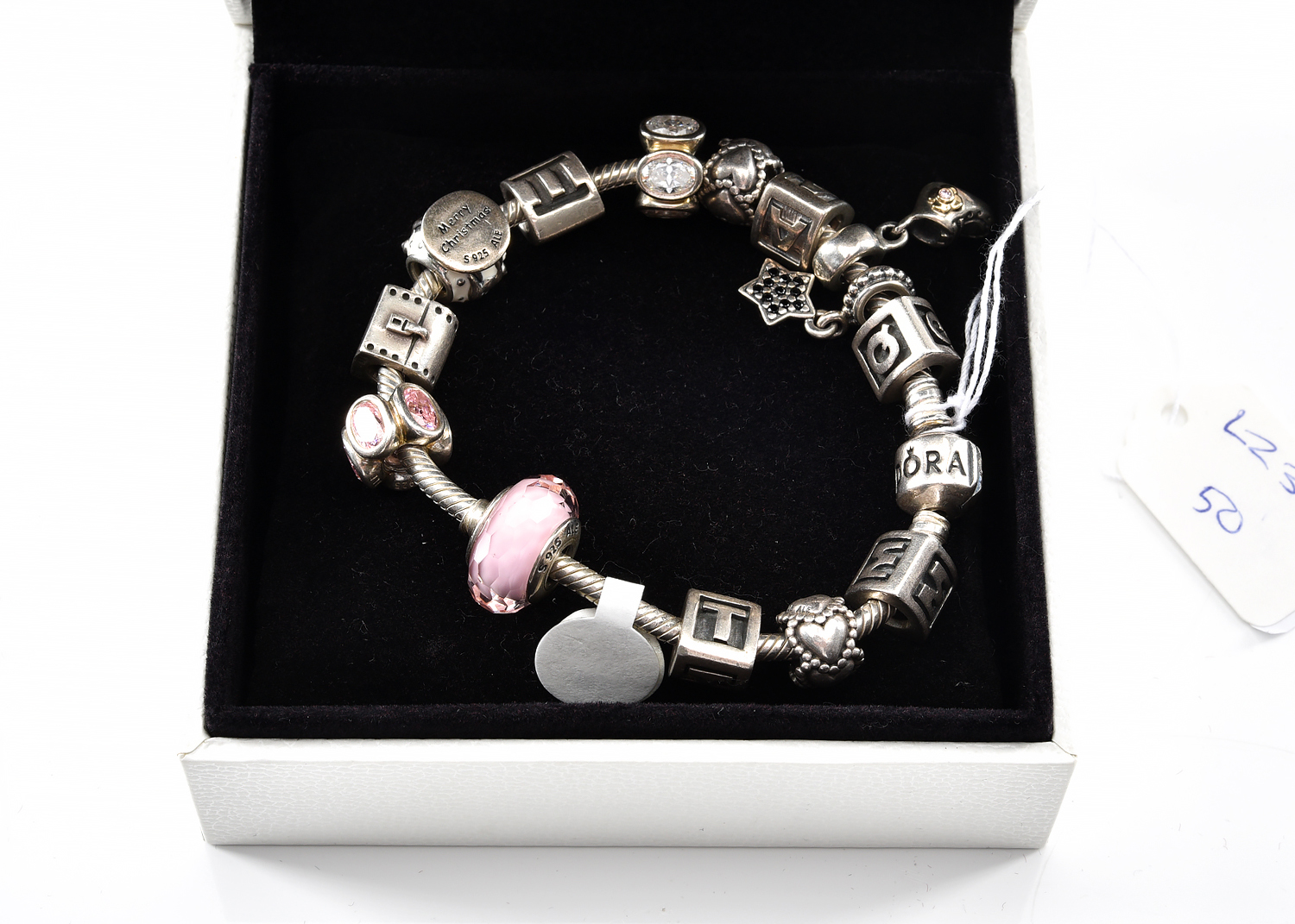 A PANDORA BRACELET AND CHARMS IN STERLING SILVER, BOXED