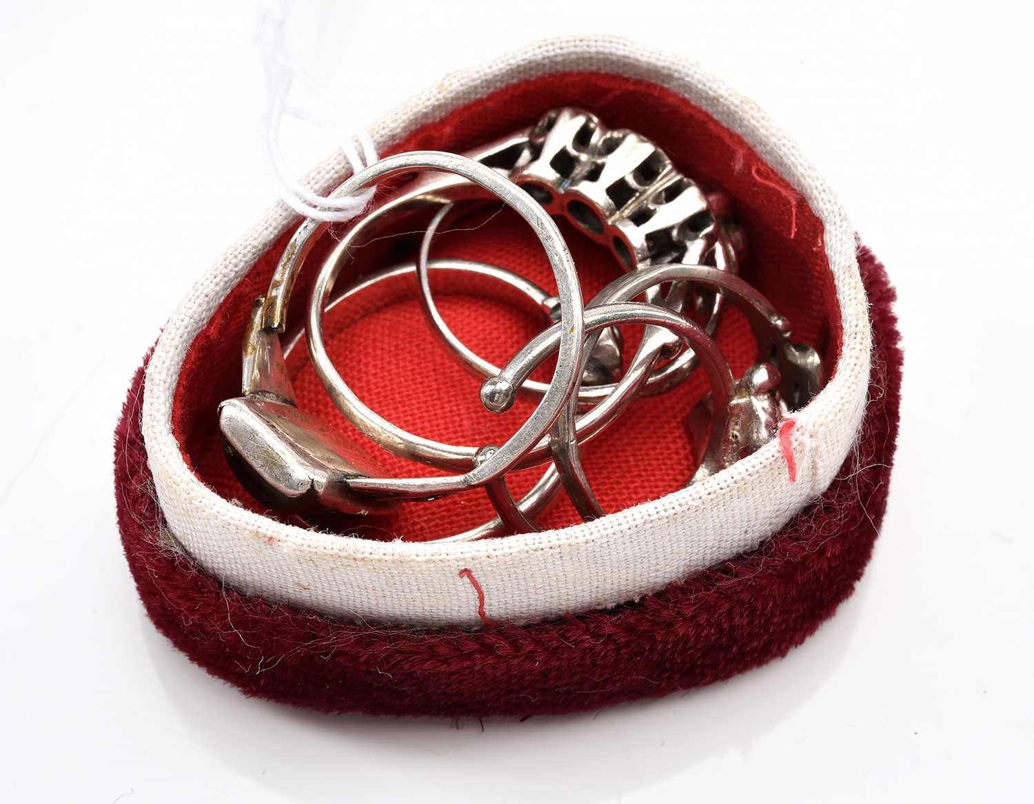 A COLLECTION OF SIX ANTIQUE AND VINTAGE RINGS IN SILVER, BOXED IN A VINTAGE PEAR SHAPED BOX
