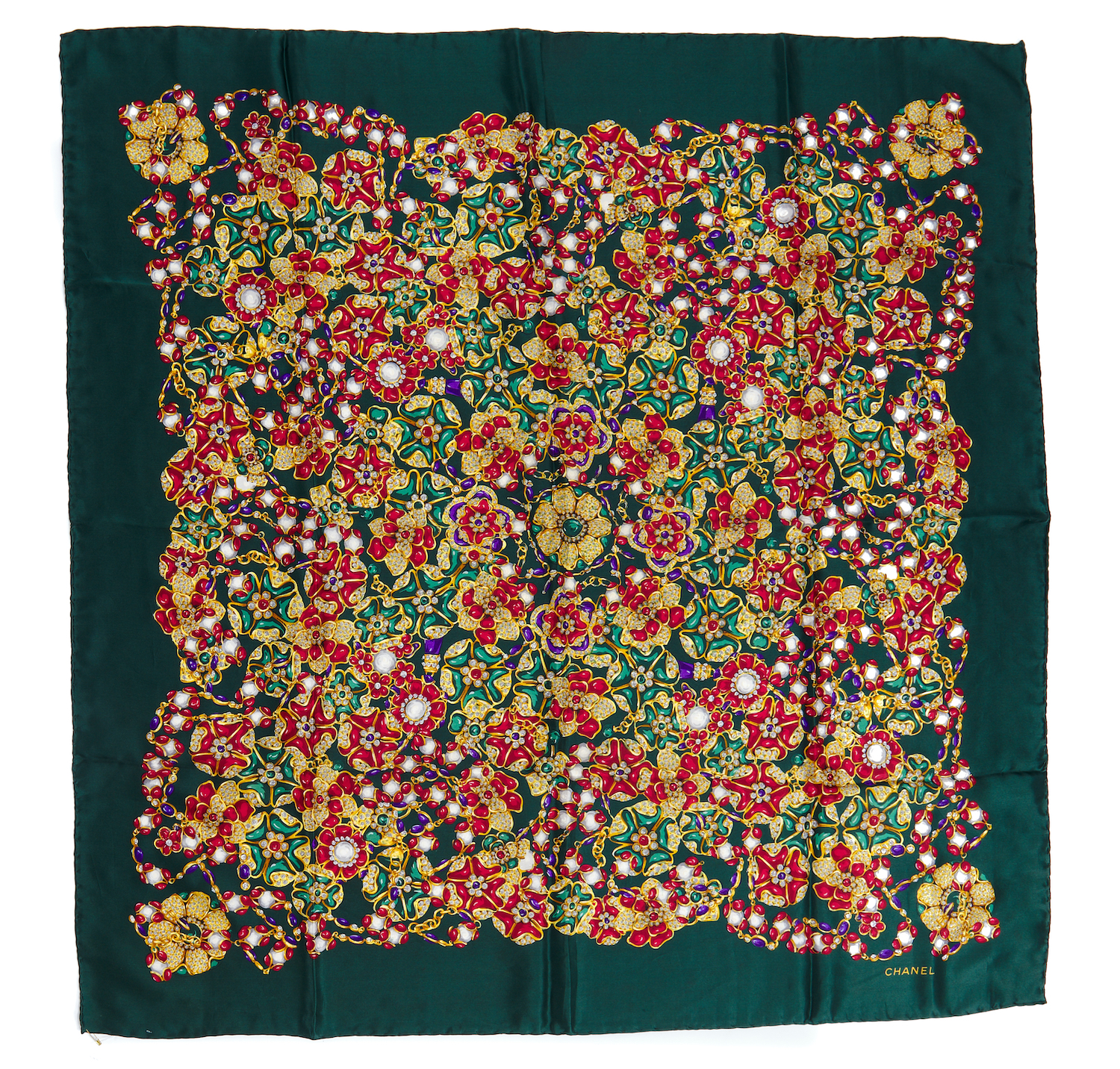 Styled with multi-coloured jewelled design on green background, 90cm square.