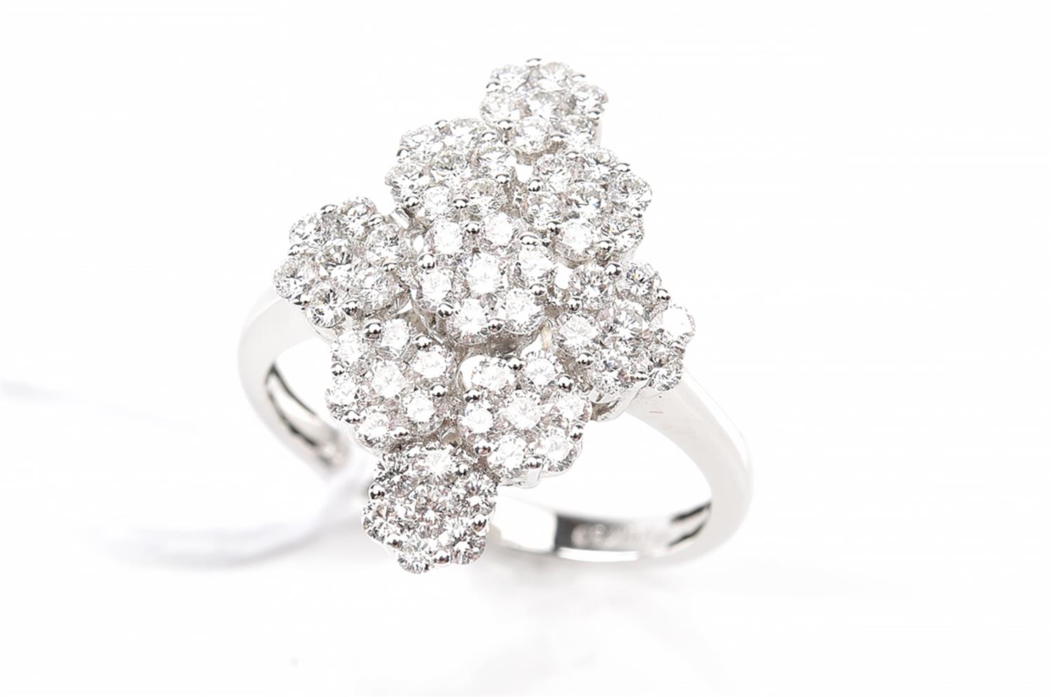 A MARQUISE SHAPED DIAMOND RING OF FLORAL DESIGN, FEATURING A CENTRAL PANEL OF PAVE SET DIAMONDS, SURROUNDED BY CONFORMING PANELS IN 18CT WHITE GOLD, SIZE O
