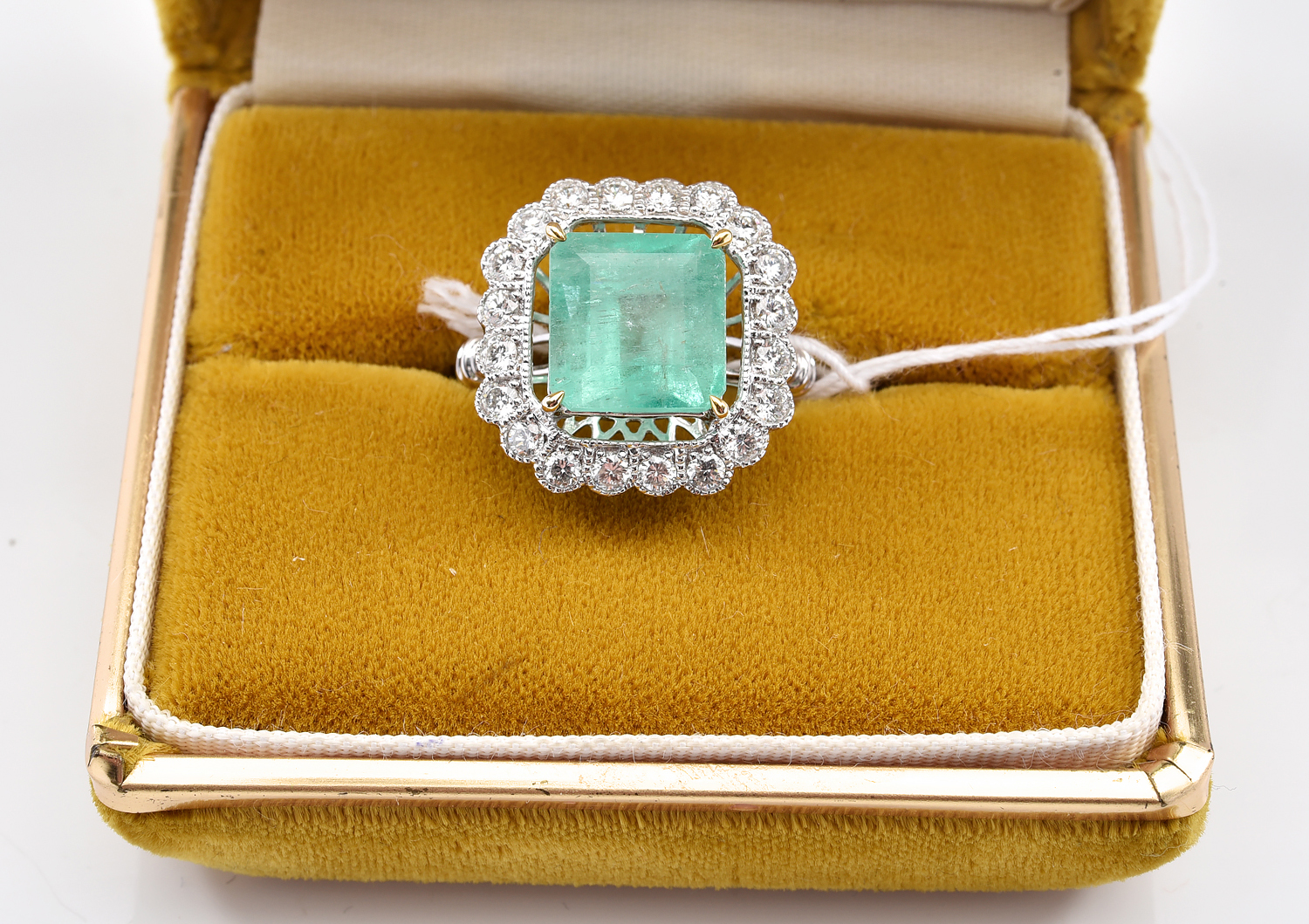 A COLOMBIAN EMERALD ESTIMATED 7.50CTS AND DIAMOND CLUSTER RING IN 18CT WHITE GOLD, SIZE L, BOXED, 5.6GMS