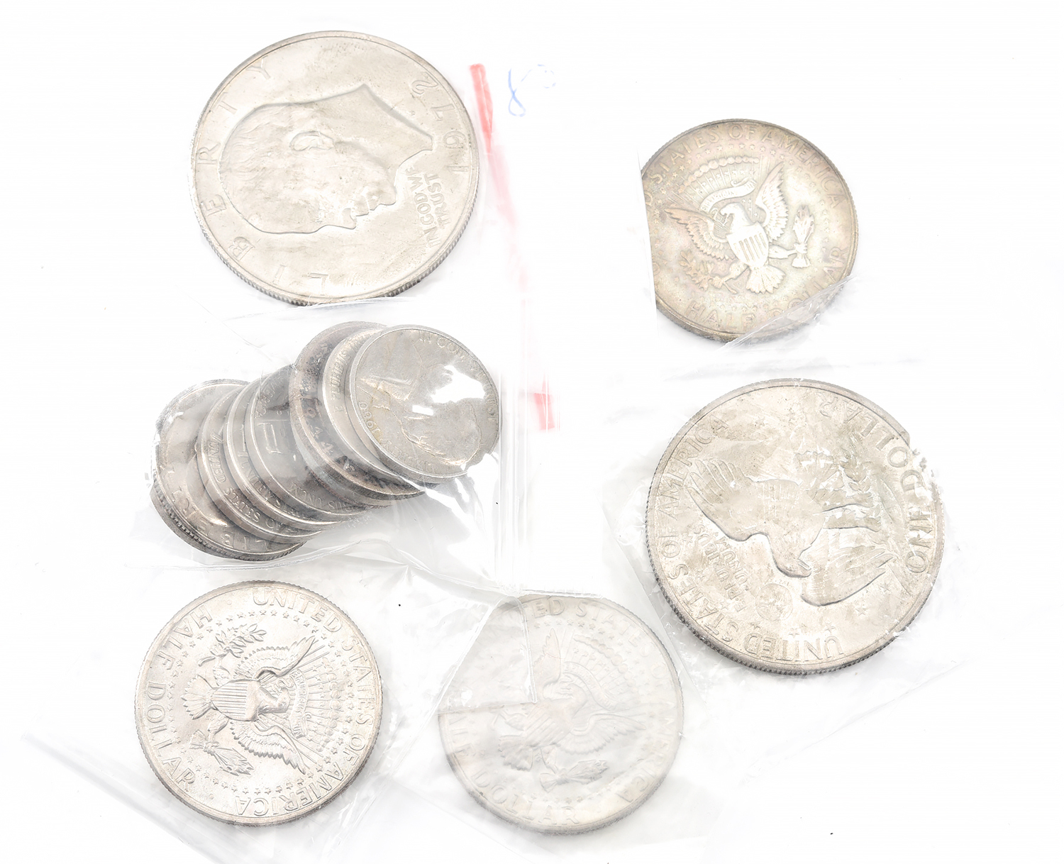 A COLLECTION OF USA VINTAGE COINS INCLUDING THREE KENNEDY HALF DOLLARS TOGETHER WITH TWO SILVER DOLLARS DATED 1971 AND 1972 ETC.