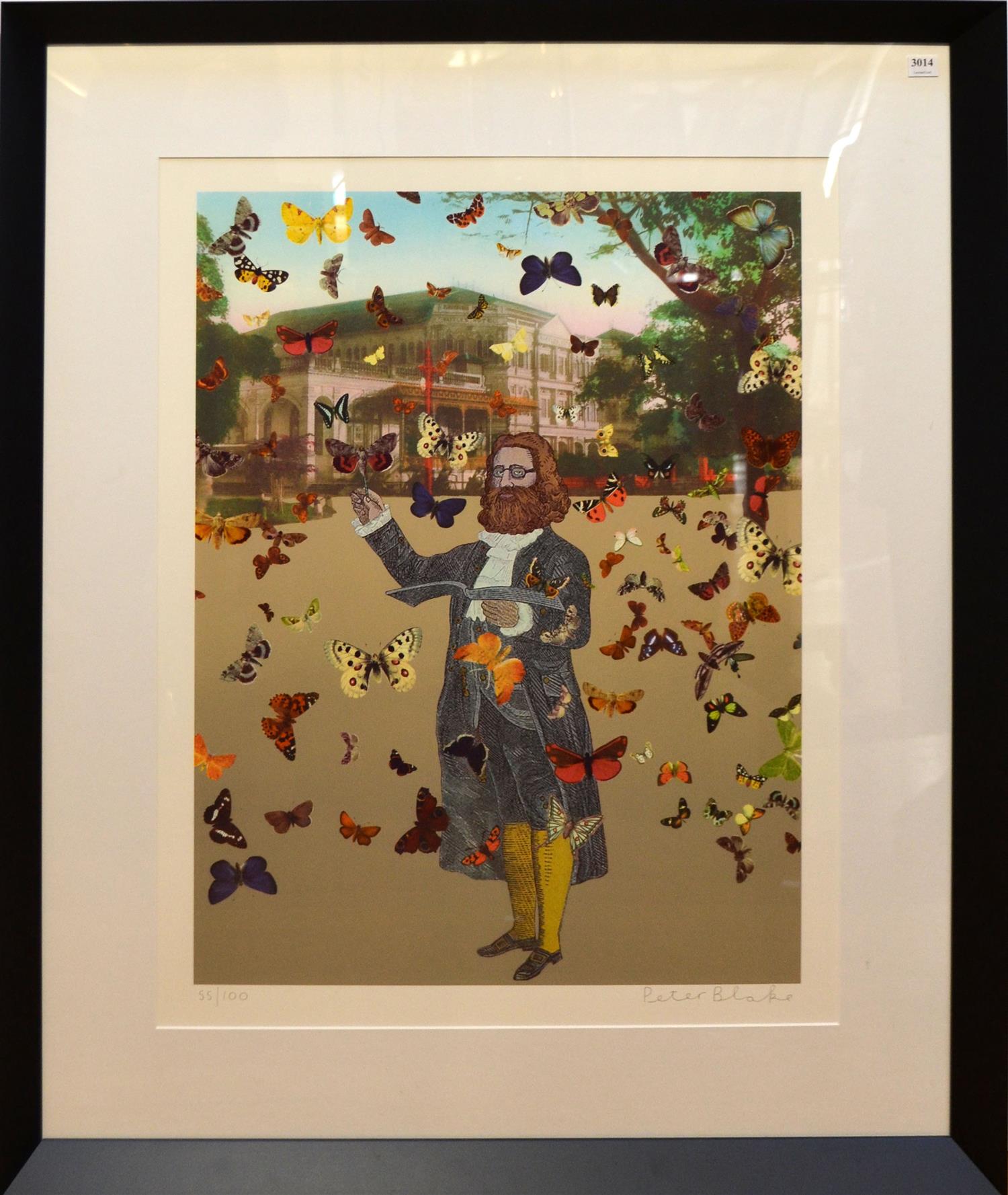 PETER BLAKE, THE BUTTERFLY MAN AT RAFFLES HOTEL, SCREENPRINT ED. 55/100, 65 X 50CM, FRAME SIZE: 98 X 82CM, CONDITION: VERY GOOD