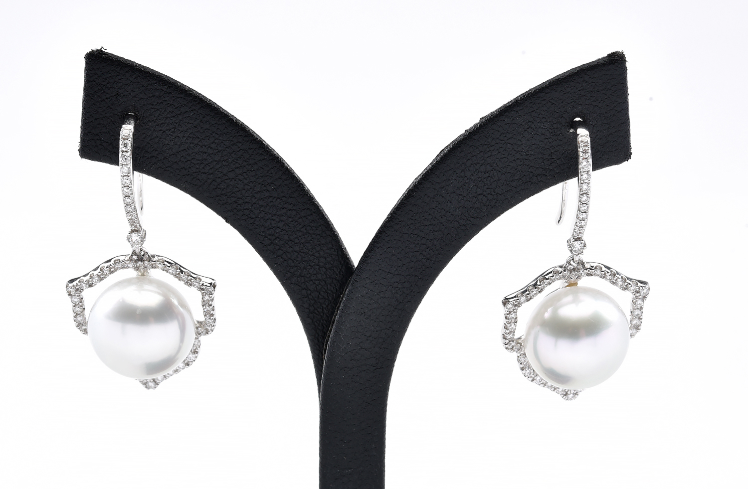 THE BUTTON SHAPED PEARLS MEASURING 11.0MM WITHIN AN OPEN FLORAL STYLE SURROUND SET WITH ROUND BRILLIANT CUT DIAMONDS AND DIAMOND SET SHEPHERD HOOK FITTINGS