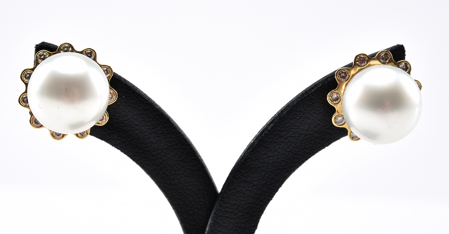 THE BUTTON SHAPED PEARLS MEASURING 12.0MM, WITHIN A BORDER OF ROUND BRILLIANT CUT CHAMPAGNE DIAMONDS