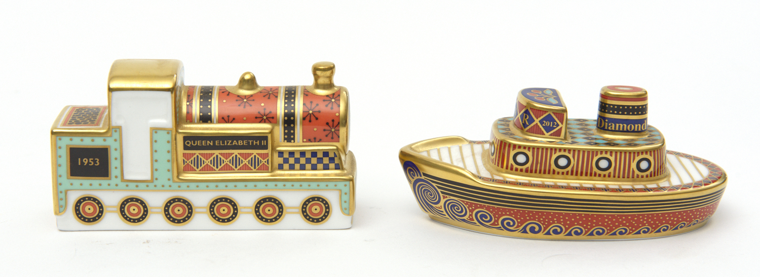 TWO ROYAL CROWN DERBY PAPERWEIGHTS, INCLUDING 'DIAMOND JUBILEE TUG BOAT' AND 'CORONATION TRAIN', BOXED