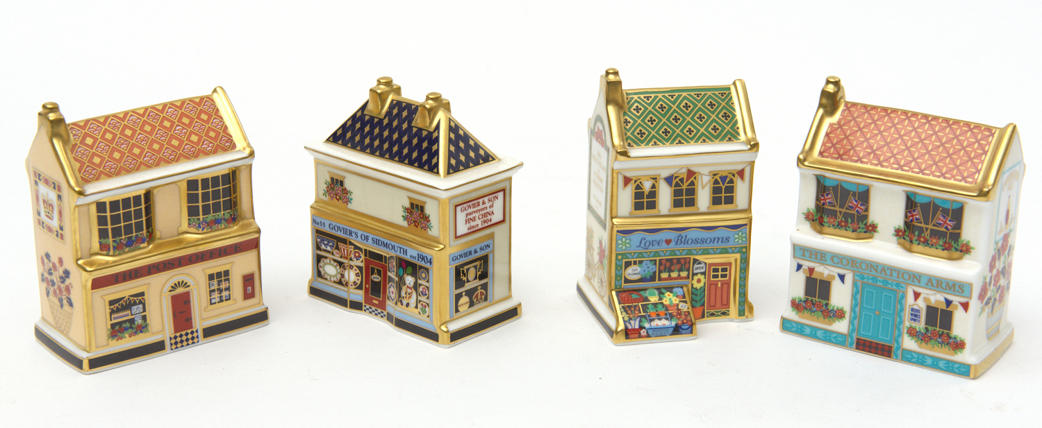 FOUR ROYAL CROWN DERBY PAPERWEIGHTS, INCLUDING 'POST OFFICE', 'WEDDING FLORIST SHIP 'LOVE BLOSSOMS'', 'GOVIERS CHINA SHOP' AND 'THE CORONATION ARMS', BOXED