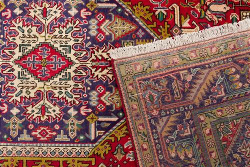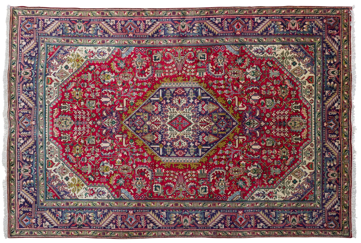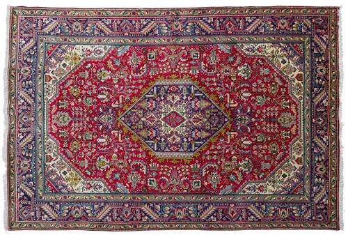 The traditional tabriz design of bold hexagonal medallion and quartered corner medallions in a red background of stylized palmettes, floral sprays & leaf forms, with a major border of palmettes and leaf forms and minor border of flower heads. The finely hand-kotted100% wool carpet of dense pile, and hard-wearing.