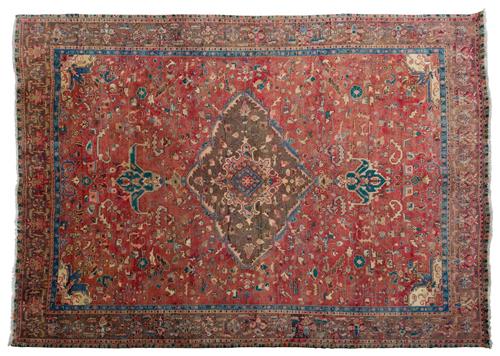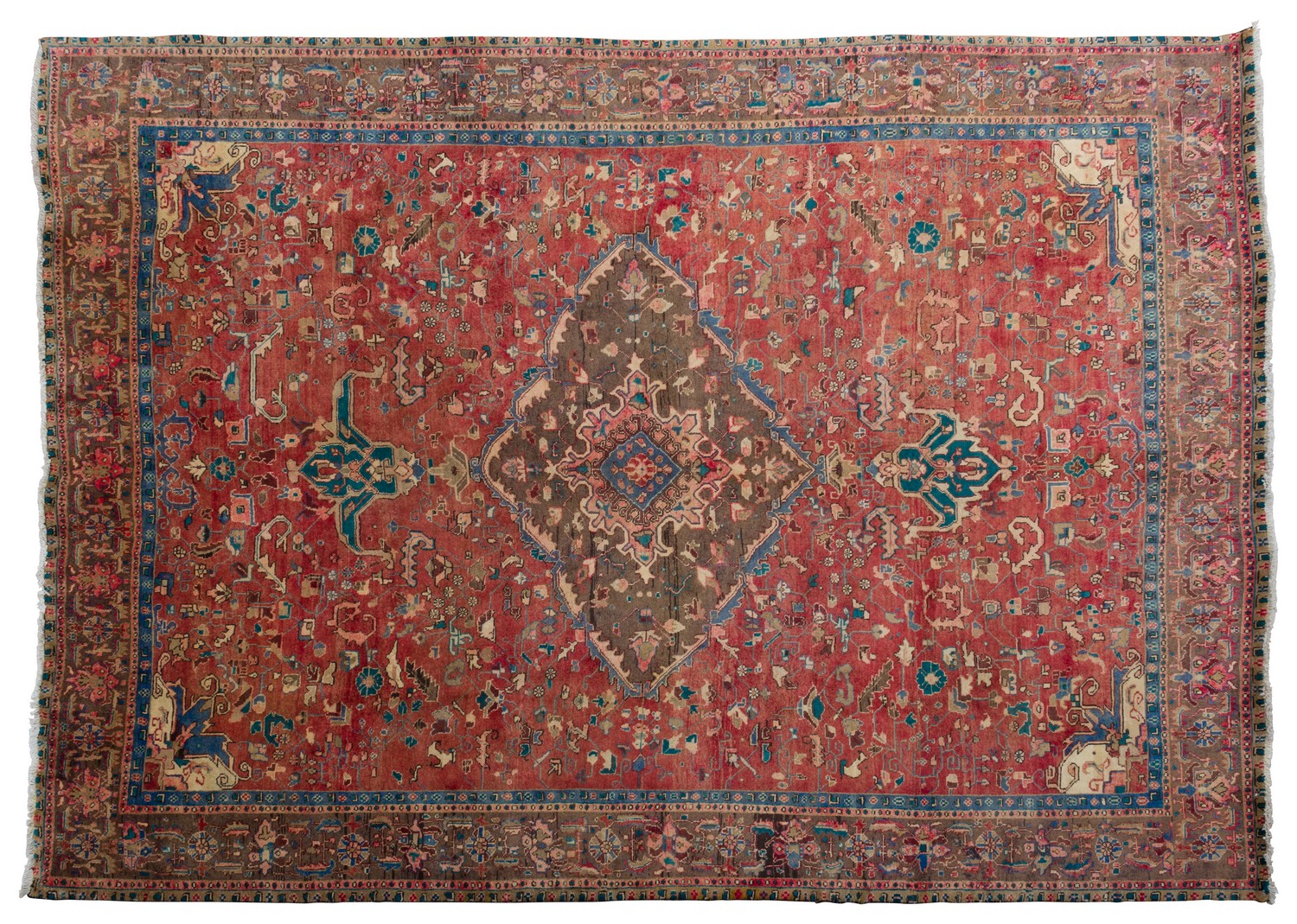 With a rare design of bold angular anchored medallion set within a terracotta-toned field of stylized floral patterns and leaf forms. The border of herati patterns and rosettes. The hand-spun wool pile with natural organic tones and finely hand-knotted city weave from the East Azerbaijan province.