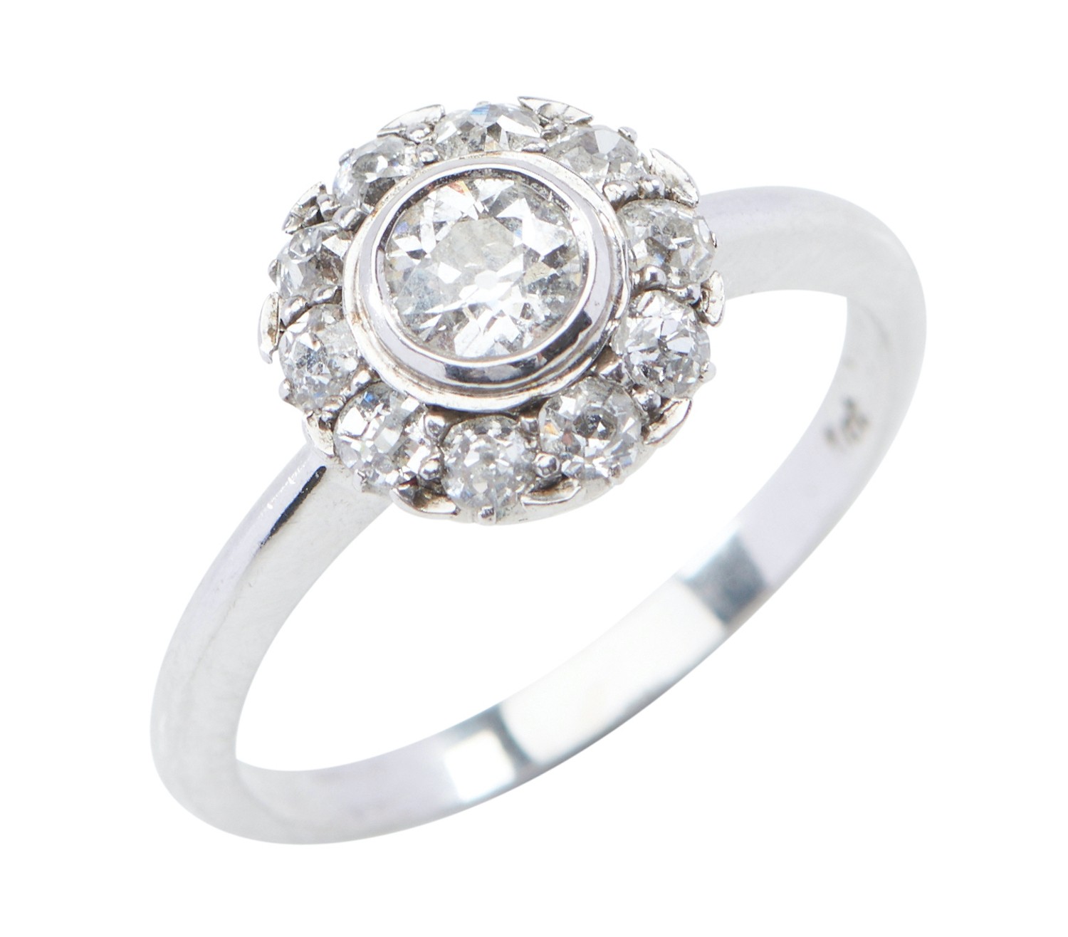 Estimated colour for diamonds H - Clarity P1 for central stone and Si-Vs for surrounding stones.