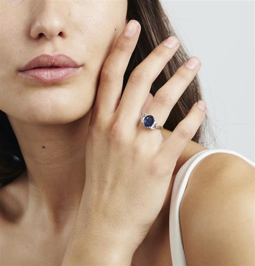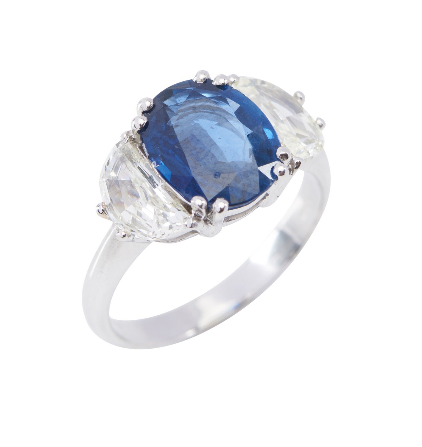 A SAPPHIRE AND DIAMOND RING - Featuring an oval sapphire weighing 3.50cts flanked by half moon cut diamonds totalling 1.35cts, in 18ct white gold, ring size M.