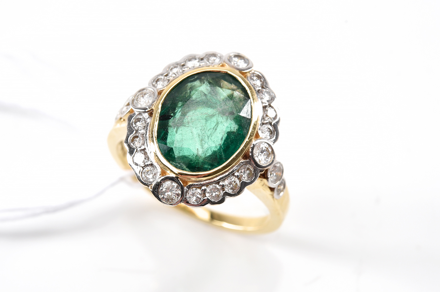 ALL STONES SECURE IN THEIR SETTINGS, EMERALD SHOWS INCLUSIONS. BAND SHOWS MINOR SIGNS OF WEAR. TOTAL DIAMOND WEIGHT 0.63CT