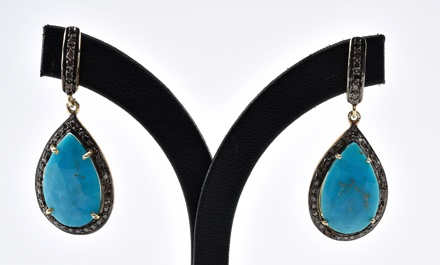 The turquoise present minor cracks and scratches; the diamonds varies in colour from brown to black; some showing chips, cracks and scratches.