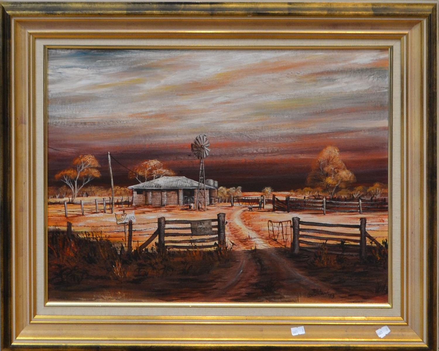 BILL BEVAN, FARMHOUSE PAINTING, OIL ON BOARD, 44 X 60CM, FRAME SIZE: 60 X 76CM, CONDITION: MINOR SURFACE SCRATCHES