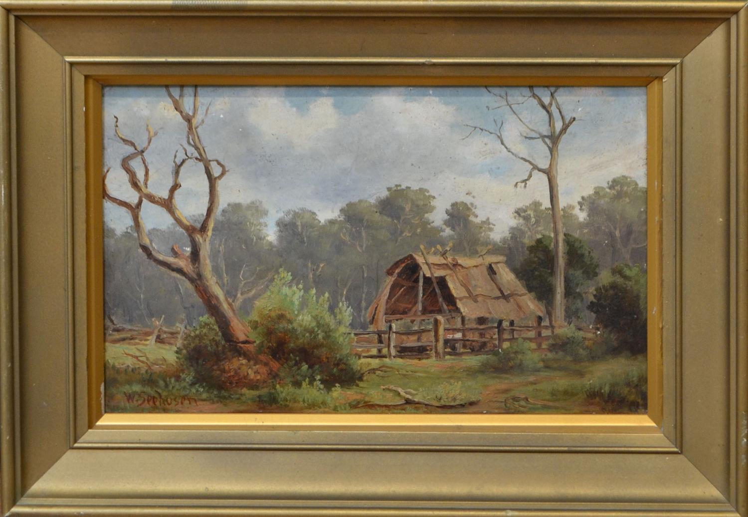 WALTER SEEHUSEN, BUSH HUT, OIL ON CANVAS, 28 X 17CM, FRAME SIZE: 27.5 X 38CM, CONDITION: HAIRLINE CRACKS THROUGHOUT, MINOR PIGMENT LOSS AND DISCOLOURATION