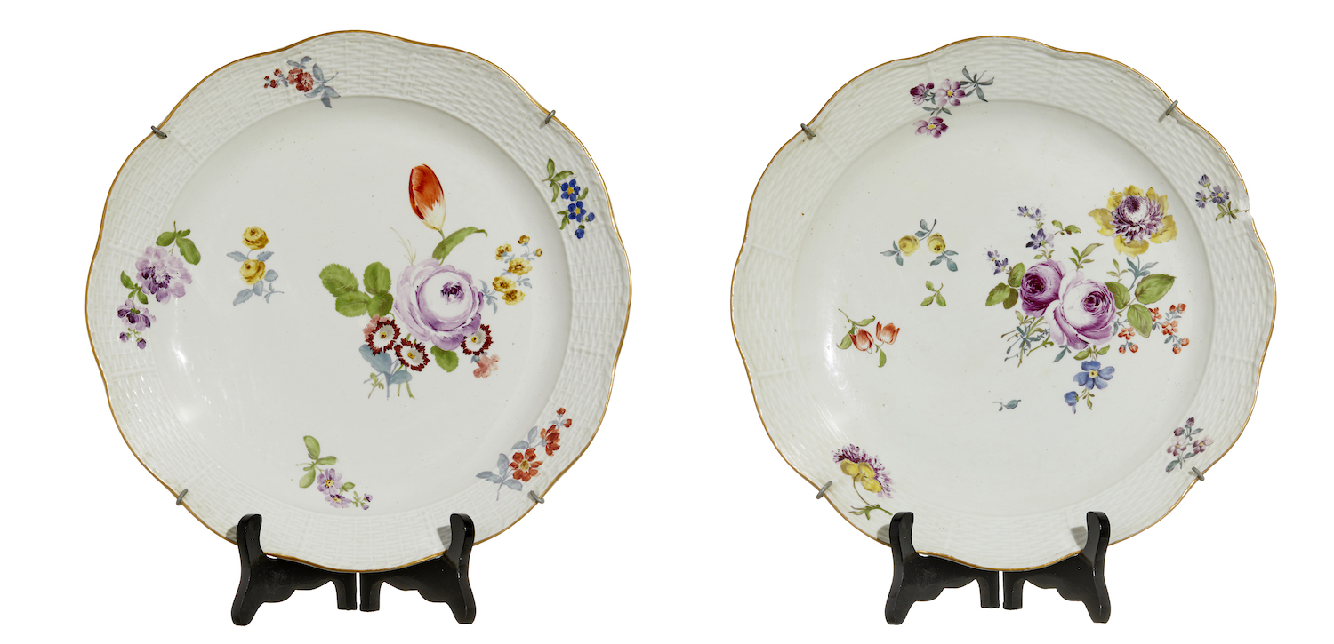 Round with ozer border, painted with sprigs and bouquets of flowers. Underglazed blue crossed swords mark.