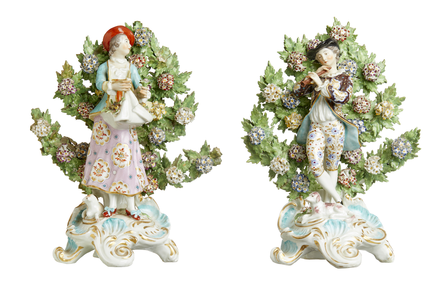 The figures are in Chelsea style and show a Shepard with a dog at his feet and a Shepardess with a sheep. Both standing against a tall green screen with white colour-tipped flowers. Both figures are marked with small gold anchors to the base of the tree which were frequently used by Samson circa 1880.