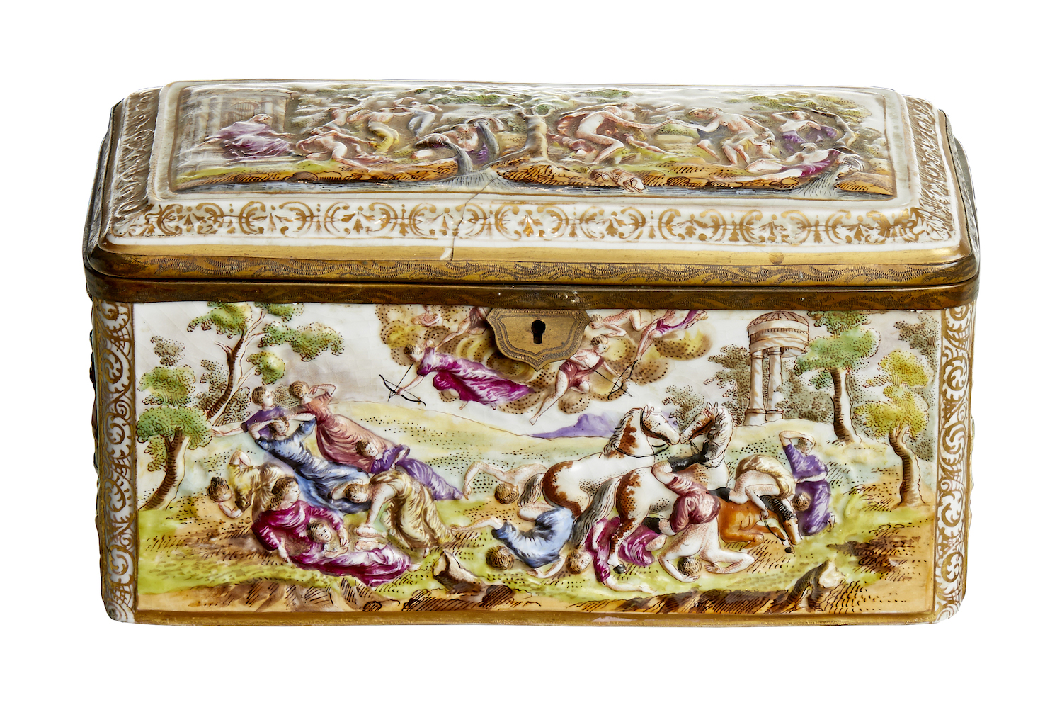 A 19TH CENTURY CAPO-DI-MONTE RECTANGULAR LIDDED TABLE CASKET