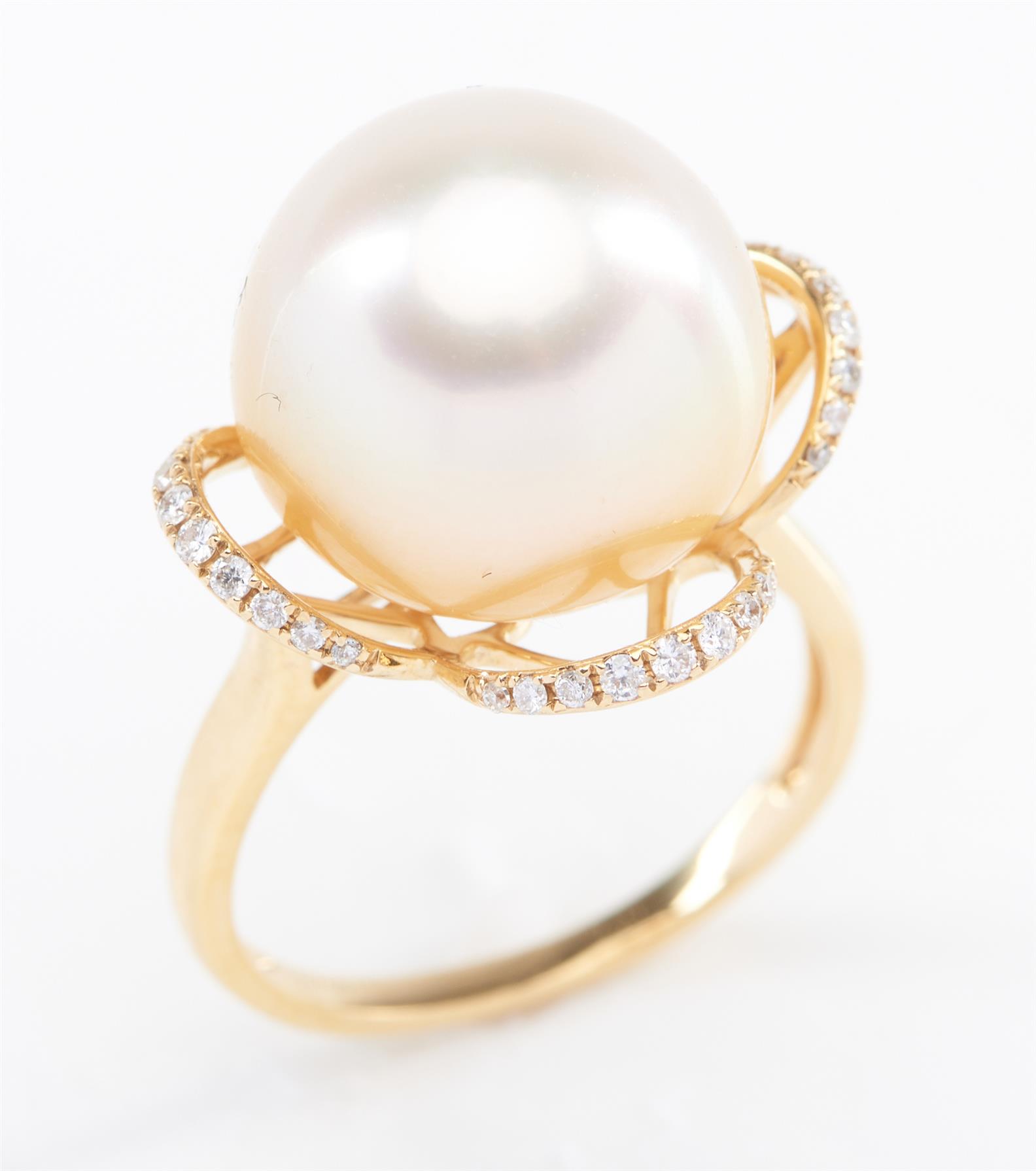 A SOUTH SEA PEARL AND DIAMOND RING - Featuring a round pearl of pale golden hues, measuring 14.25mm, within a scalloped surround set with round brilliant cut diamonds, in 18ct gold, ring size L.