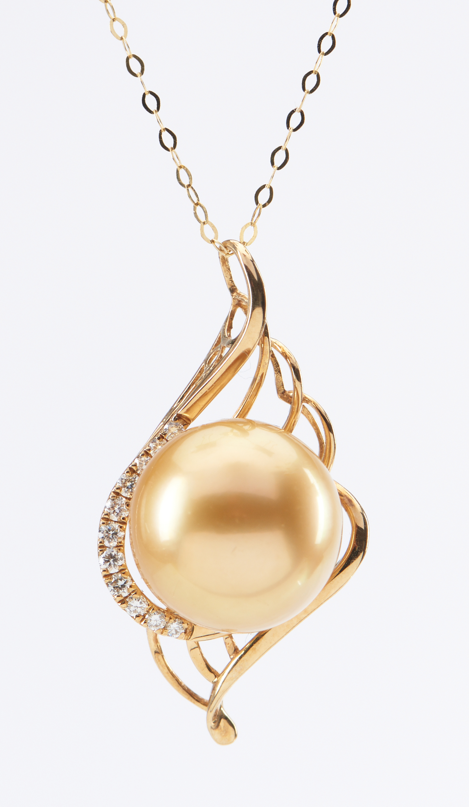 A SOUTH SEA PEARL AND DIAMOND PENDANT - Featuring a round pearl of deep golden hues, measuring 12.6mm, within an abstract surround detailed with round brilliant cut diamonds totalling 0.123cts, in 18ct gold.
