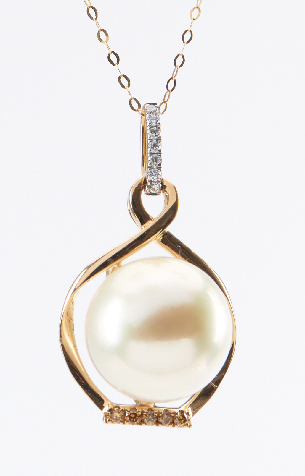 A SOUTH SEA PEARL AND DIAMOND PENDANT IN 18CT GOLD, FEATURING A ROUND PEARL MEASURING 12MM, WITHIN AN INFINITE SURROUND SET WITH DIAMONDS, ON A DIAMOND SET BALE, TO A FINE TRACE CHAIN OF 480MM, 5.2GMS