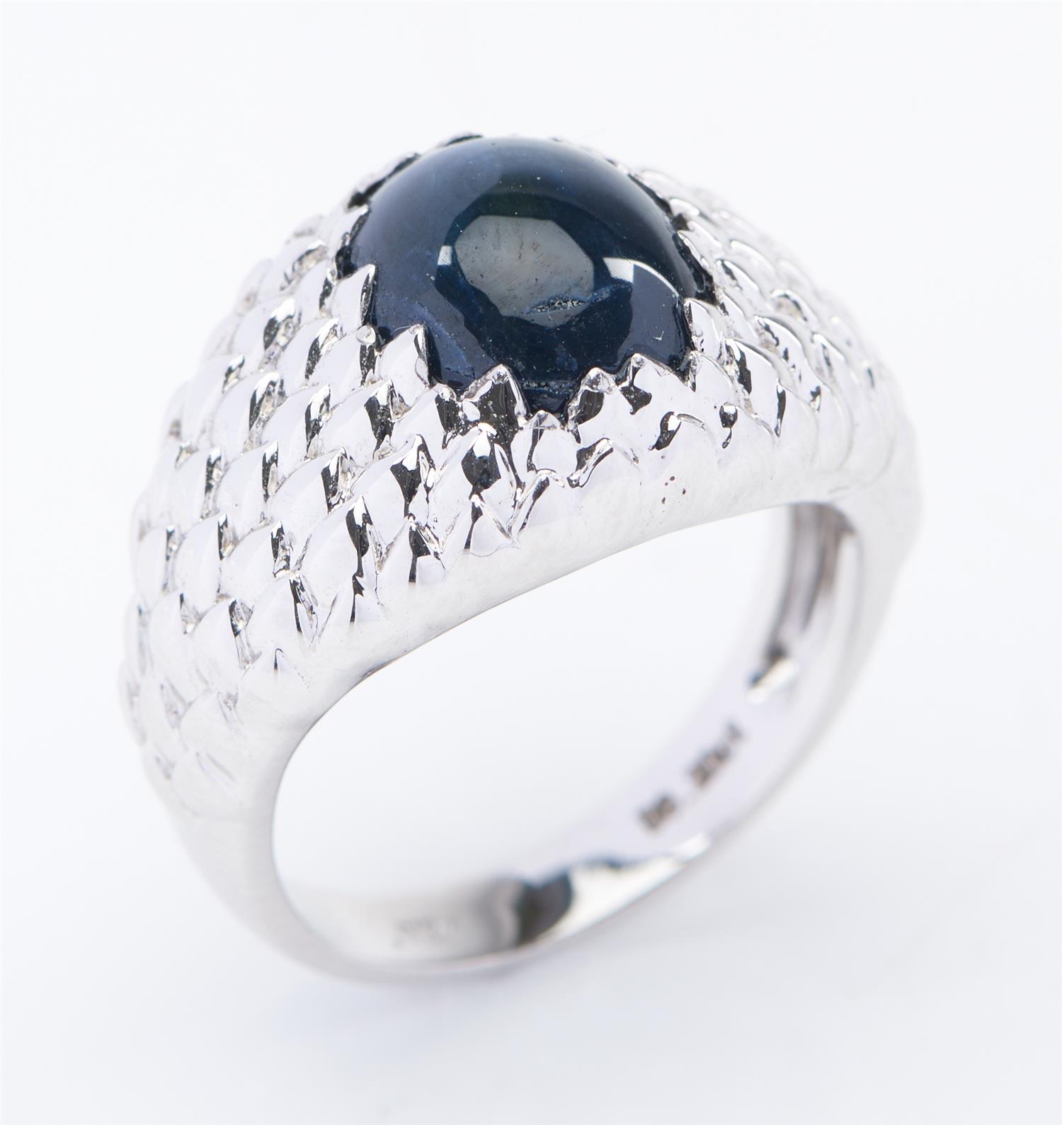 A STAR SAPPHIRE SIGNET RING IN 18CT WHITE GOLD, FEATURING CABOCHON CUT BLUE SAPPHIRE WEIGHING 4CTS, WITHIN A TEXTURED DOMED SURROUND, SIZE N-O, 8.2GMS