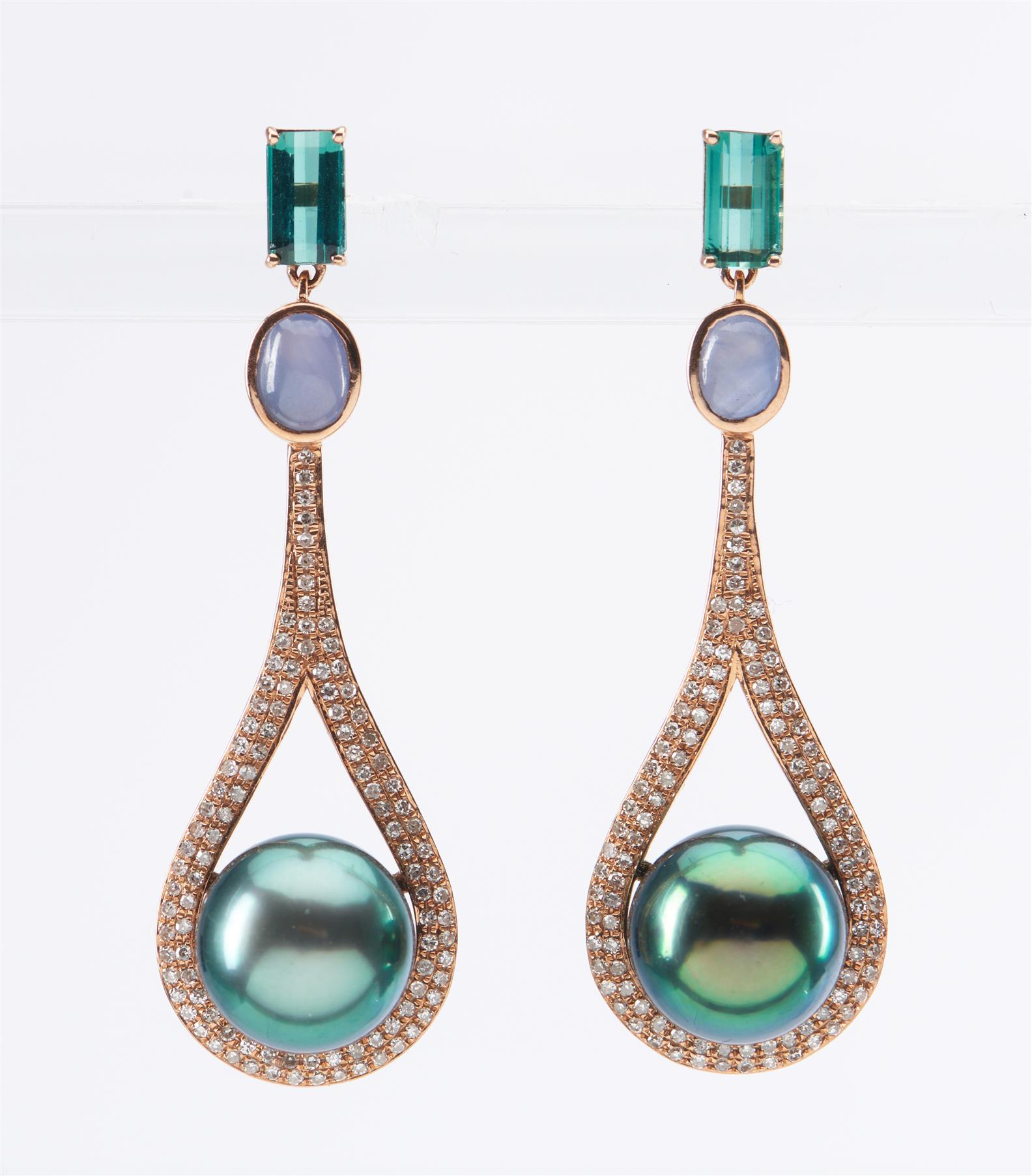 Each earring comprising a round pearl of dark grey hues, measuring 10.5mm, within an open diamond set drop shaped surround capped with a sapphire cut en cabochon, suspended on an emerald cut tourmaline stud fitting.