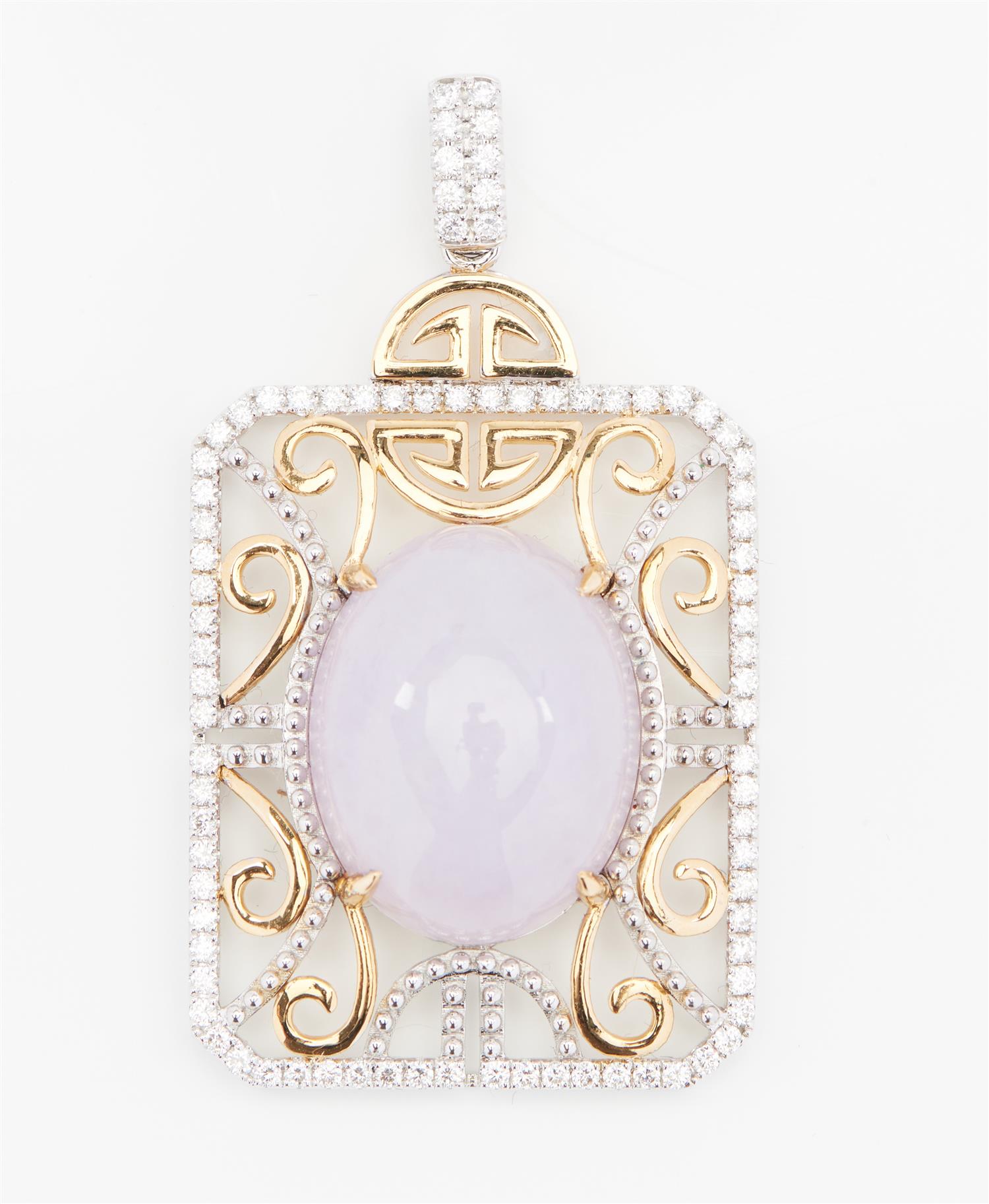 A JADEITE AND DIAMOND PENDANT IN 18CT GOLD, FEATURING AN OVAL LAVENDER JADEITE OF 22CTS, WITHIN A PIERCED RECTANGULAR PLAQUE SET WITH ROUND BRILLIANT CUT DIAMONDS, LENGTH 45MM, 11.6GMS