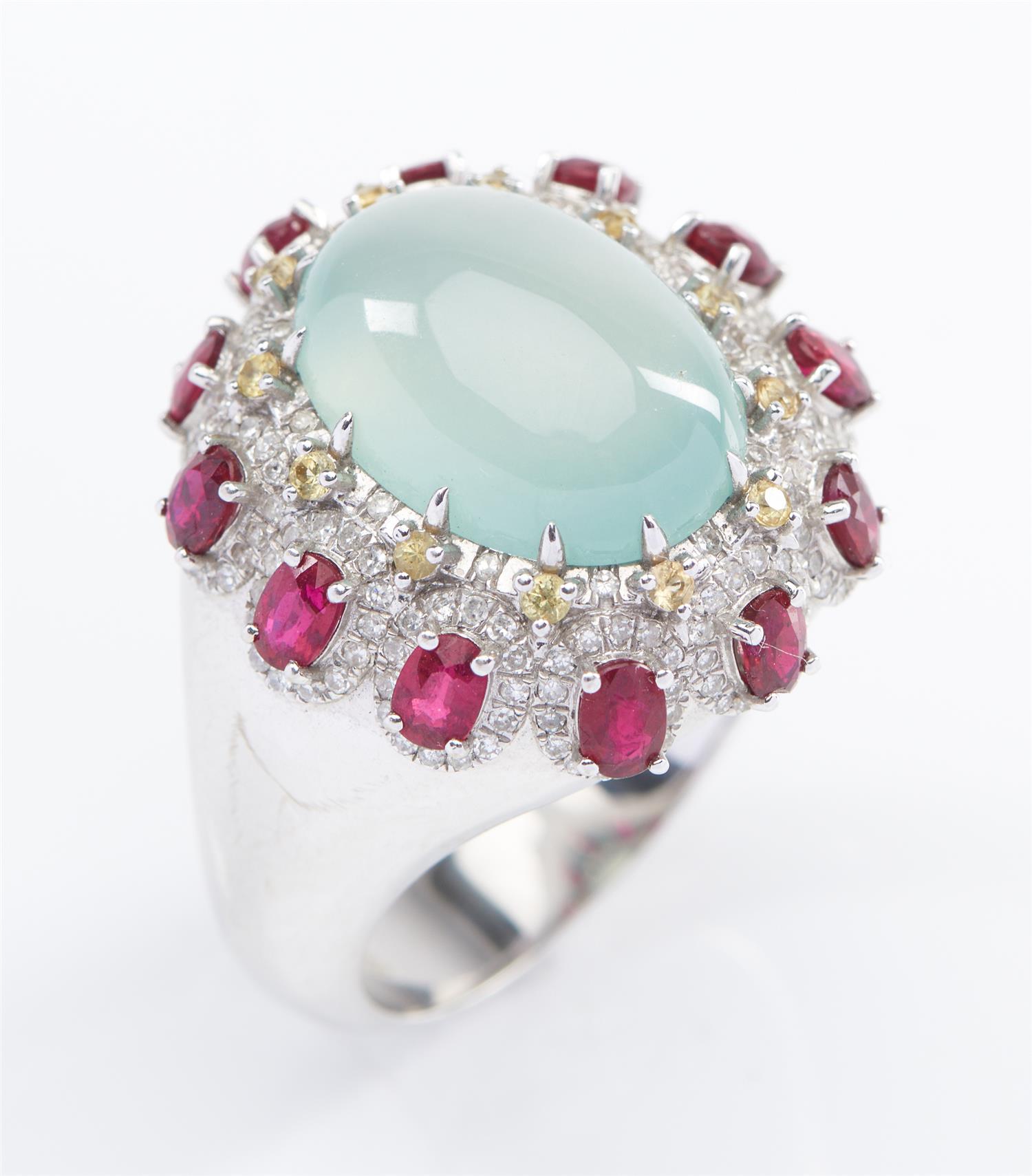 A JADEITE, RUBY AND DIAMOND RING IN TWO TONE 18CT GOLD, FEATURING A CABOCHON JADEITE OF 27CTS, WITH IN A DECORATIVE GALLERY SET WITH RUBY AND DIAMONDS, SIZE O, 10.5GMS