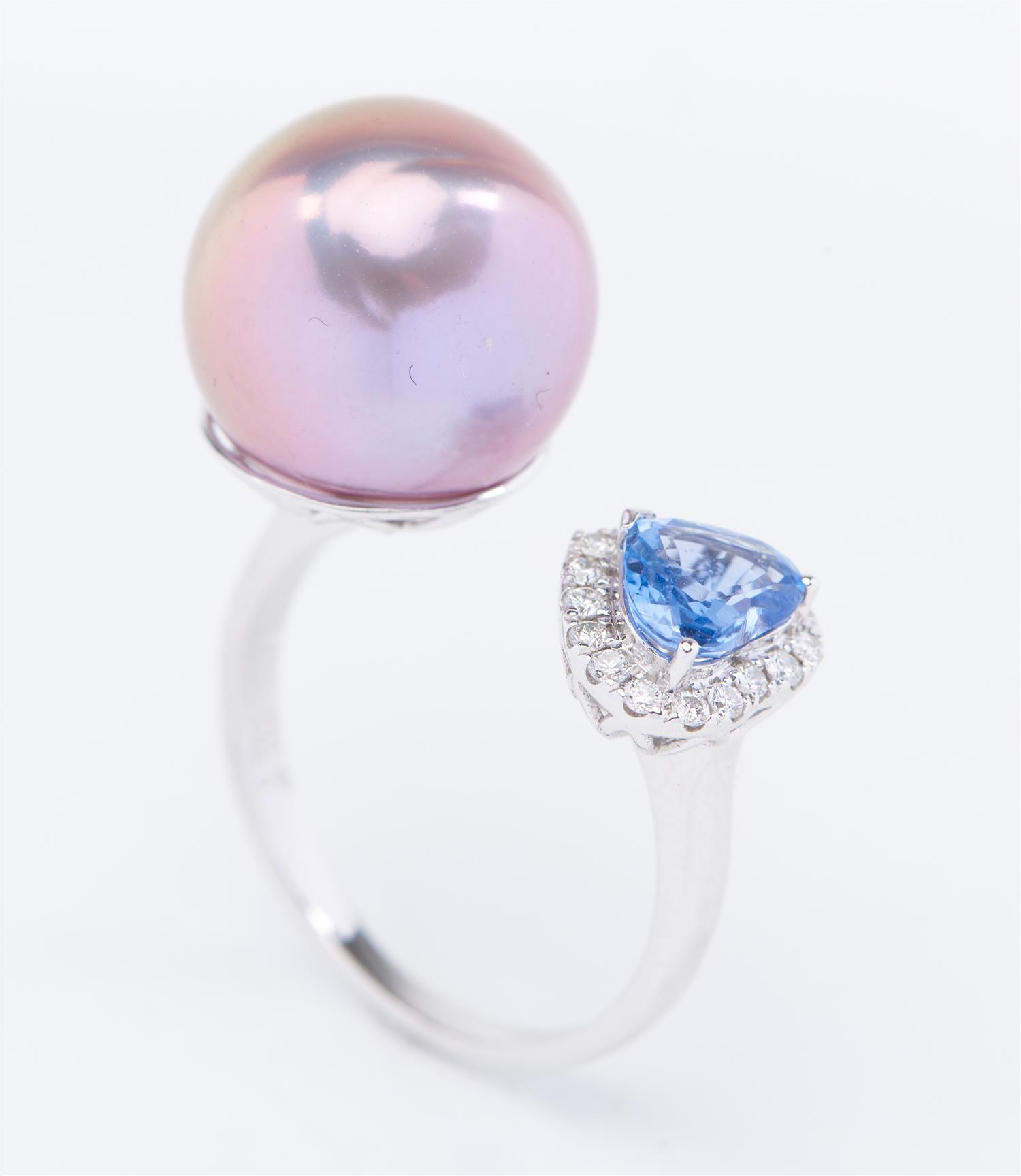 A FRESHWATER PEARL, SAPPHIRE AND DIAMOND RING IN 18CT WHITE GOLD, FEATURING AN OPEN SHANK SET WITH A PEARL MEASURING 13MM AND A HEART SHAPED SAPPHIRE AND DIAMOND CLUSTER, SIZE Q, 7GMS
