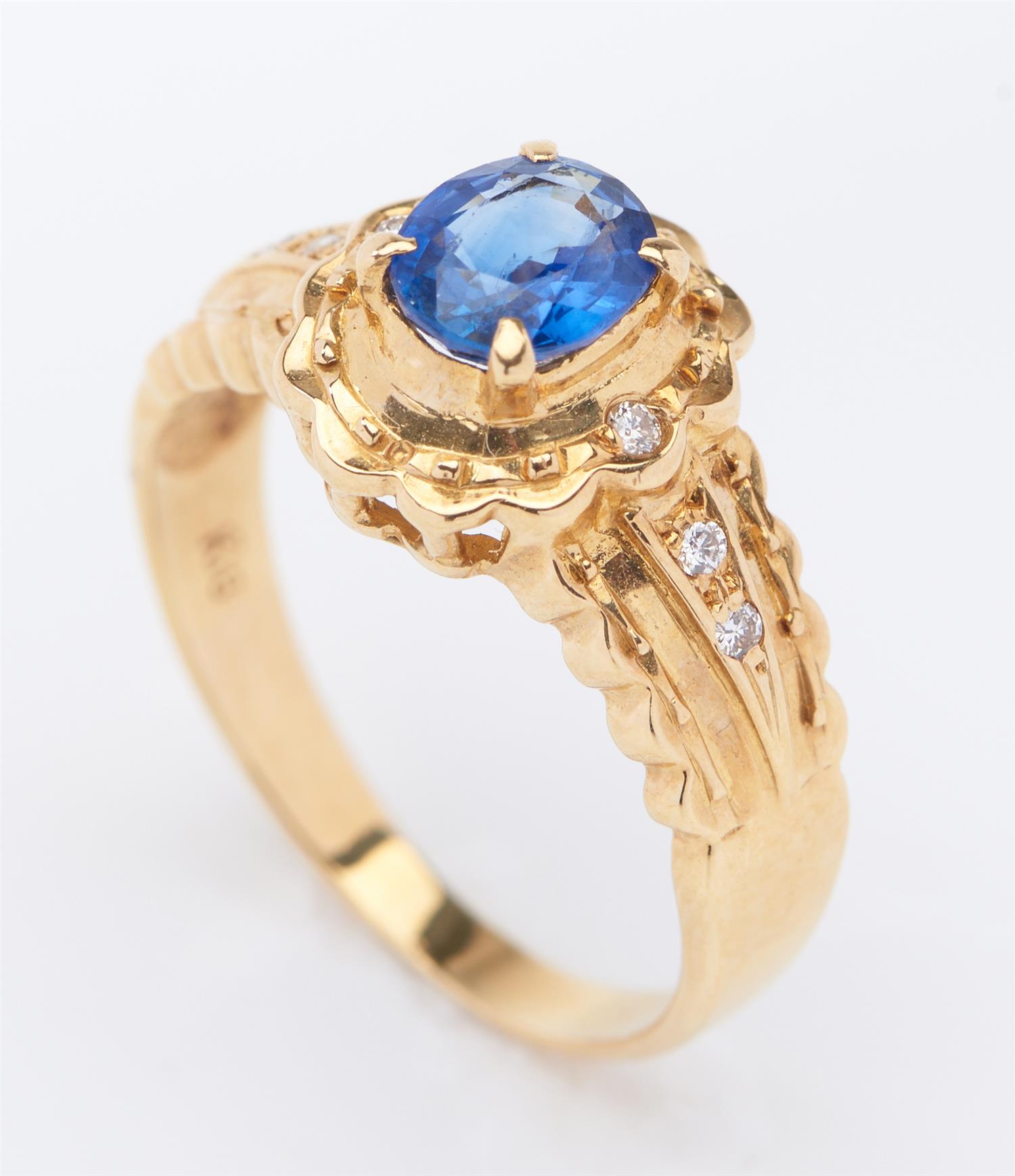 A SAPPHIRE AND DIAMOND DRESS RING IN 18CT GOLD, CENTRALLY SET WITH A CUSHION CUT BLUE SAPPHIRE WEIGHING 0.75CT, WITHIN A SCALLOPED BORDER AND DIAMOND SET SHOULDERS, SIZE L, 3.7GMS