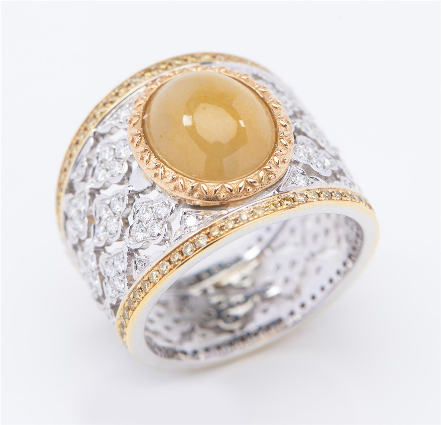 A JADEITE, YELLOW DIAMOND AND DIAMOND RING FEATURING A CABOCHON GREEN JADEITE OF 5.50CTS IN A SURROUND OF ROUND BRILLIANT CUT DIAMON...