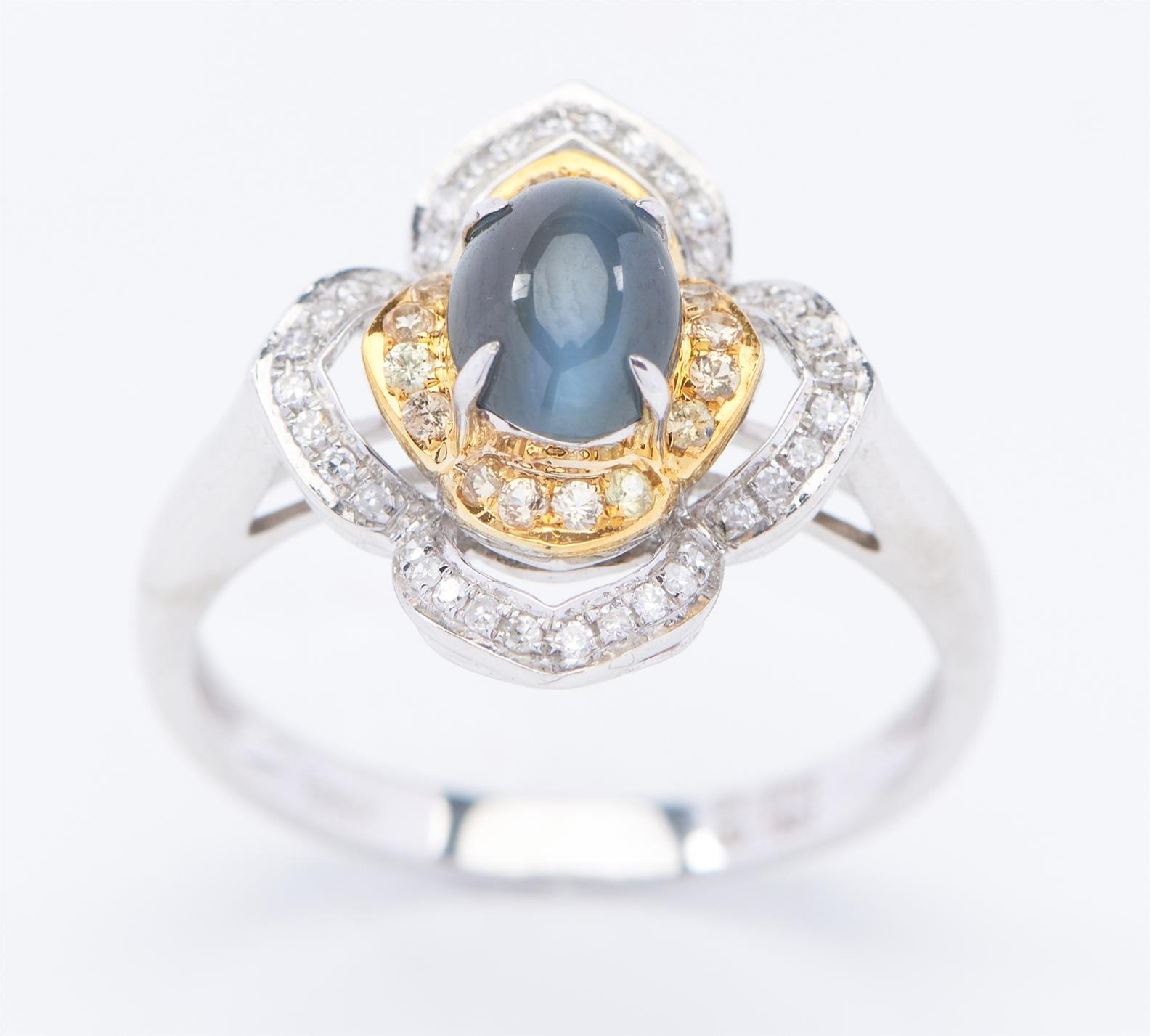 AN ALEXANDRITE AND DIAMOND RING - Of stylised floral design, featuring an oval alexandrite cut en cabochon weighing 1.27cts, claw set within a petalled surround, detailed with round brilliant cut diamonds, totalling 0.16cts, in two tone 18ct gold, ring size M.