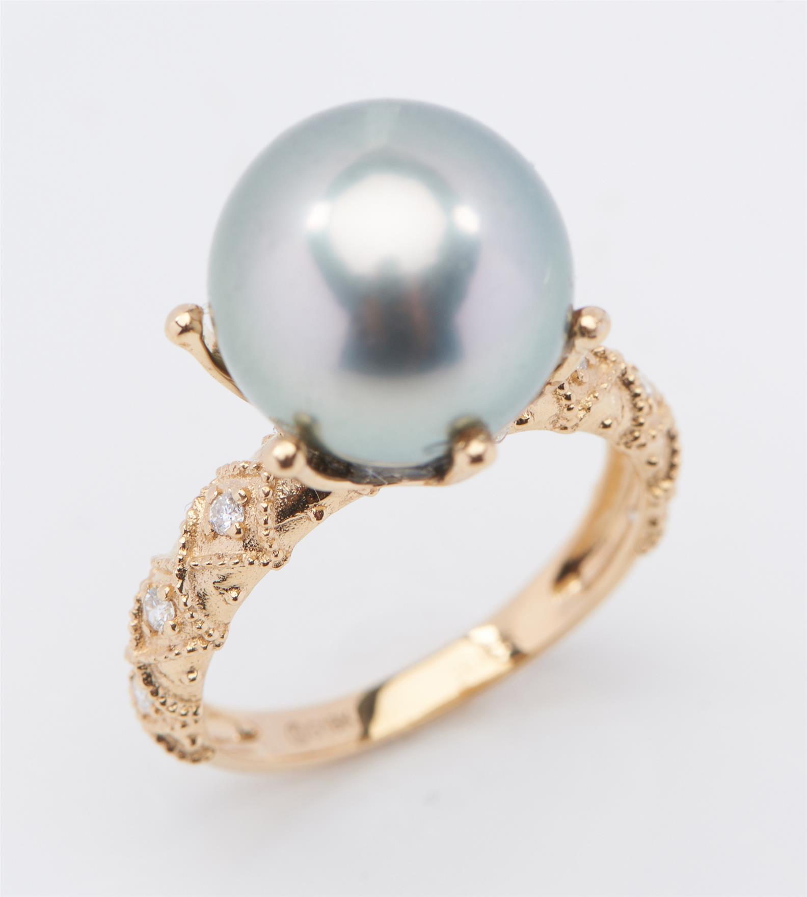 A TAHITIAN PEARL AND DIAMOND RING - Featuring a round pearl of grey hues, measuring 14.0mm, claw set within decorative diamond set shoulders, in 18ct gold, ring size K-L.