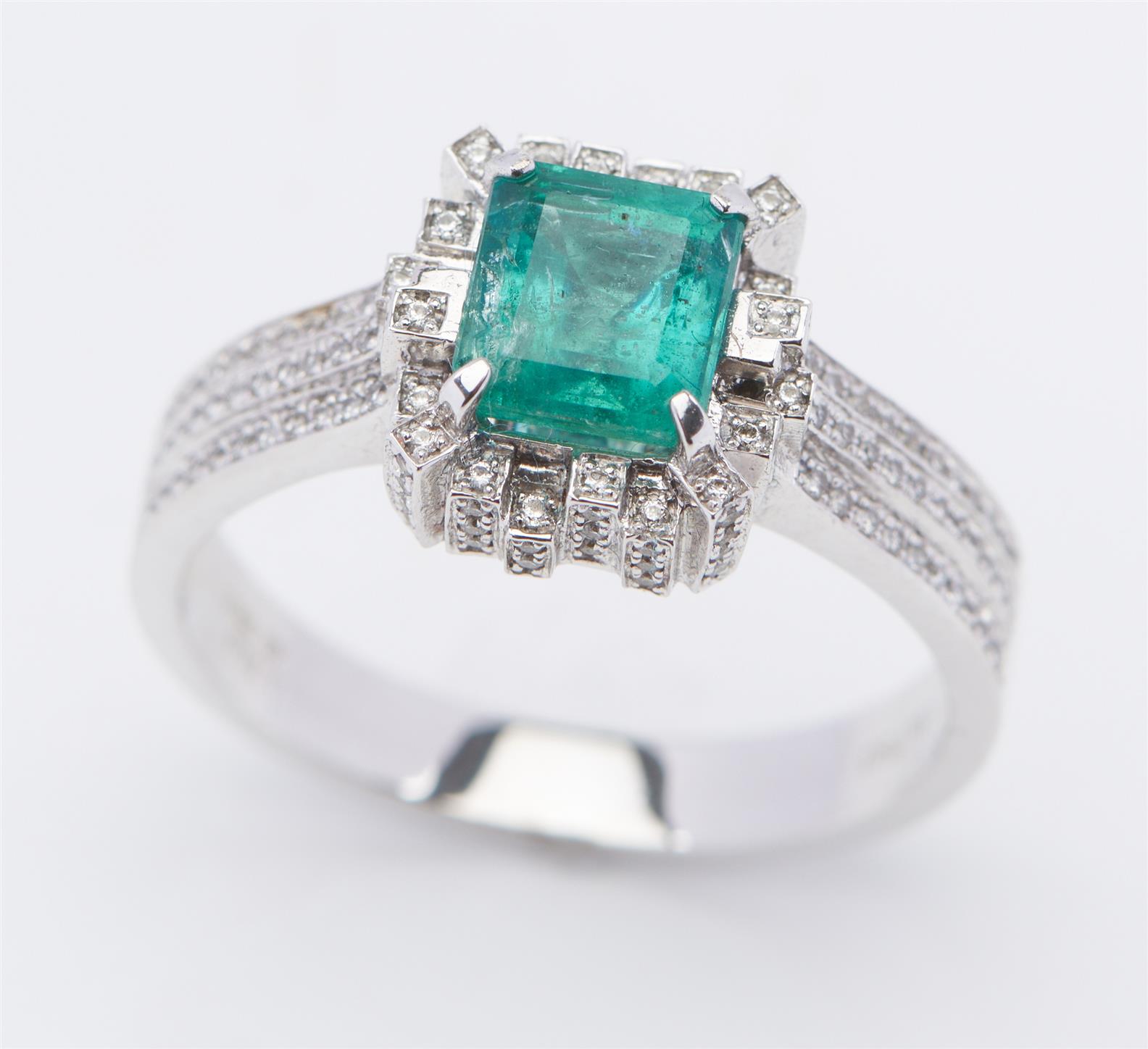 AN EMERALD AND DIAMOND RING - Featuring an emerald cut emerald weighing 1.51cts, within a stepped diamond set gallery and claws and diamond set shoulders, in 18ct white gold, ring size Q.