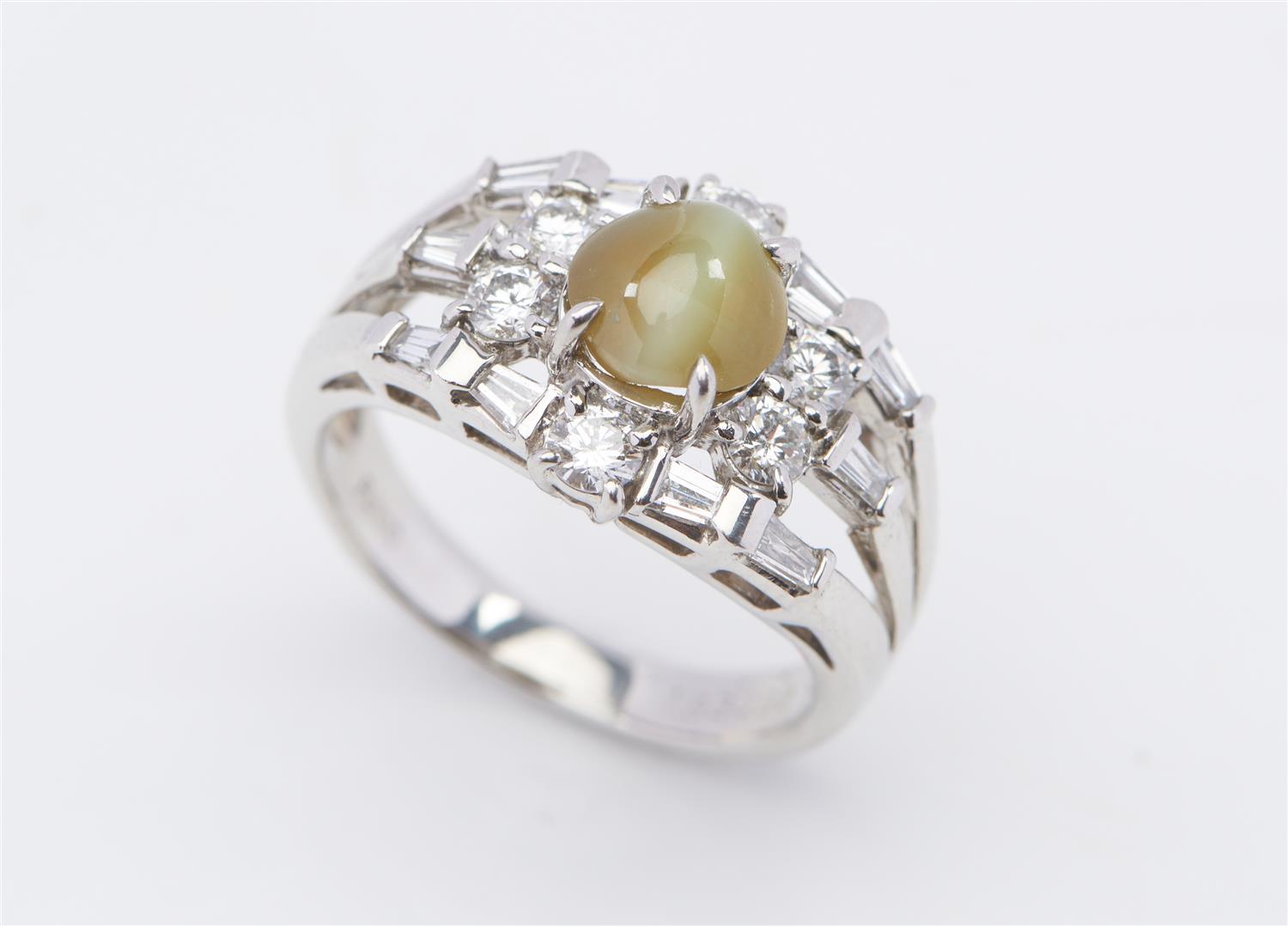 A CHRYSOBERYL AND DIAMOND RING IN PLATINUM, FEATURING A CABOCHON CUT CHRYSOBERYL OF 1.83CTS, WITHIN A SURROUND OF DIAMONDS TOTALLING 0.80CT, SIZE L, 7.9GMS