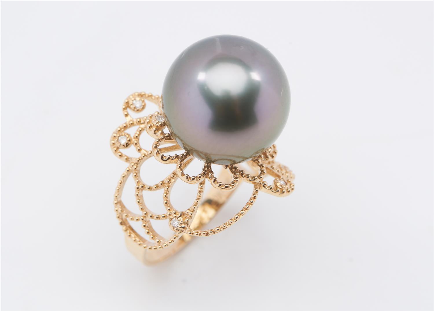 A TAHITIAN PEARL AND DIAMOND RING IN 18CT GOLD, CENTRALLY SET WITH A ROUND PEARL OF DARK GREY HUES MEASURING 14.3MM, WITHIN A PIERCED SURROUND DETAILED WITH DIAMONDS, SIZE L-M, 7.5GMS