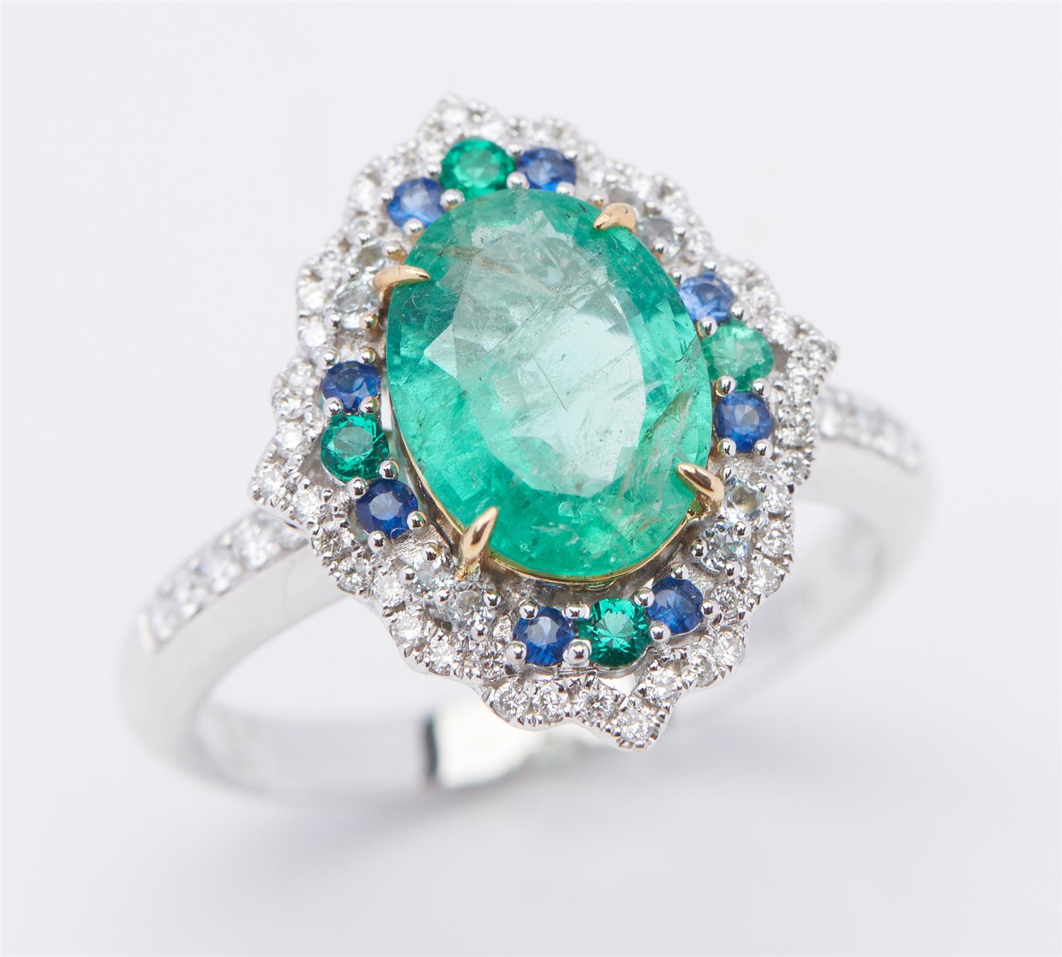 AN EMERALD, SAPPHIRE, AQUAMARINE AND DIAMOND RING IN 18CT WHITE GOLD, FEATURING AN OVAL CUT EMERALD OF 2.085CTS, WITHIN A SCALLOPED SURROUND OF SAPPHIRES, AQUAMARINES AND ROUND BRILLIANT CUT DIAMONDS, SIZE P, 5.3GMS