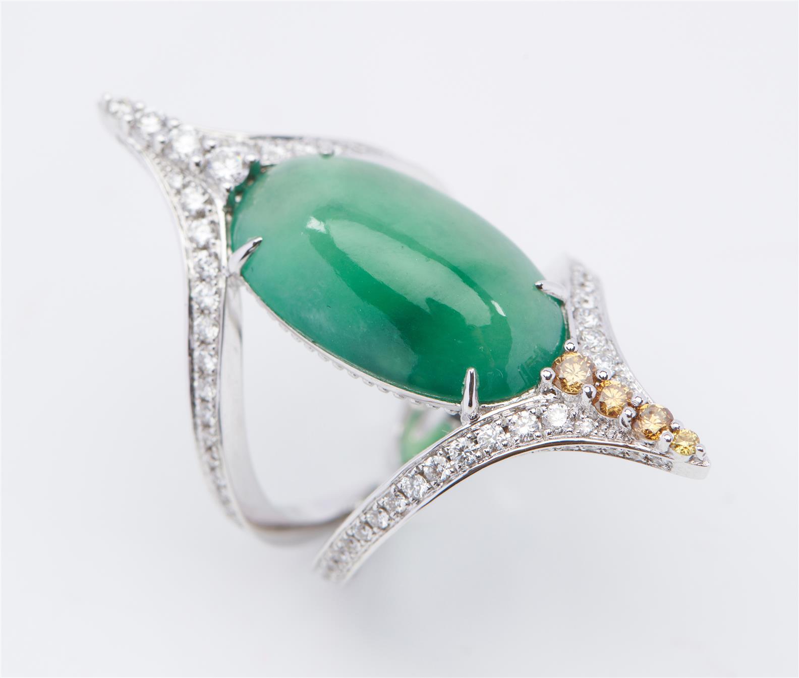 A JADEITE AND DIAMOND RING - Featuring an oval green jadeite cut en cabochon, weighing 8.0cts, claw set within decorative pointed surround of round brilliant cut diamonds, in two tone 18ct gold, ring size O-P.