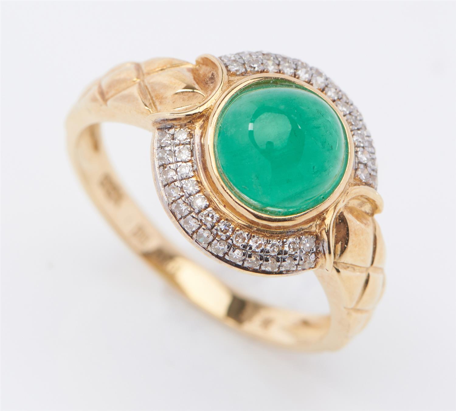 AN EMERALD AND DIAMOND CLUSTER RING IN 18CT GOLD, CENTRALLY SET WITH A CABOCHON CUT EMERALD WEIGHING 2.10CTS, WITHIN A BORDER OF ROUND BRILLIANT CUT DIAMONDS TOTALLING 1.70CTS, SIZE M-N, 3.6GMS